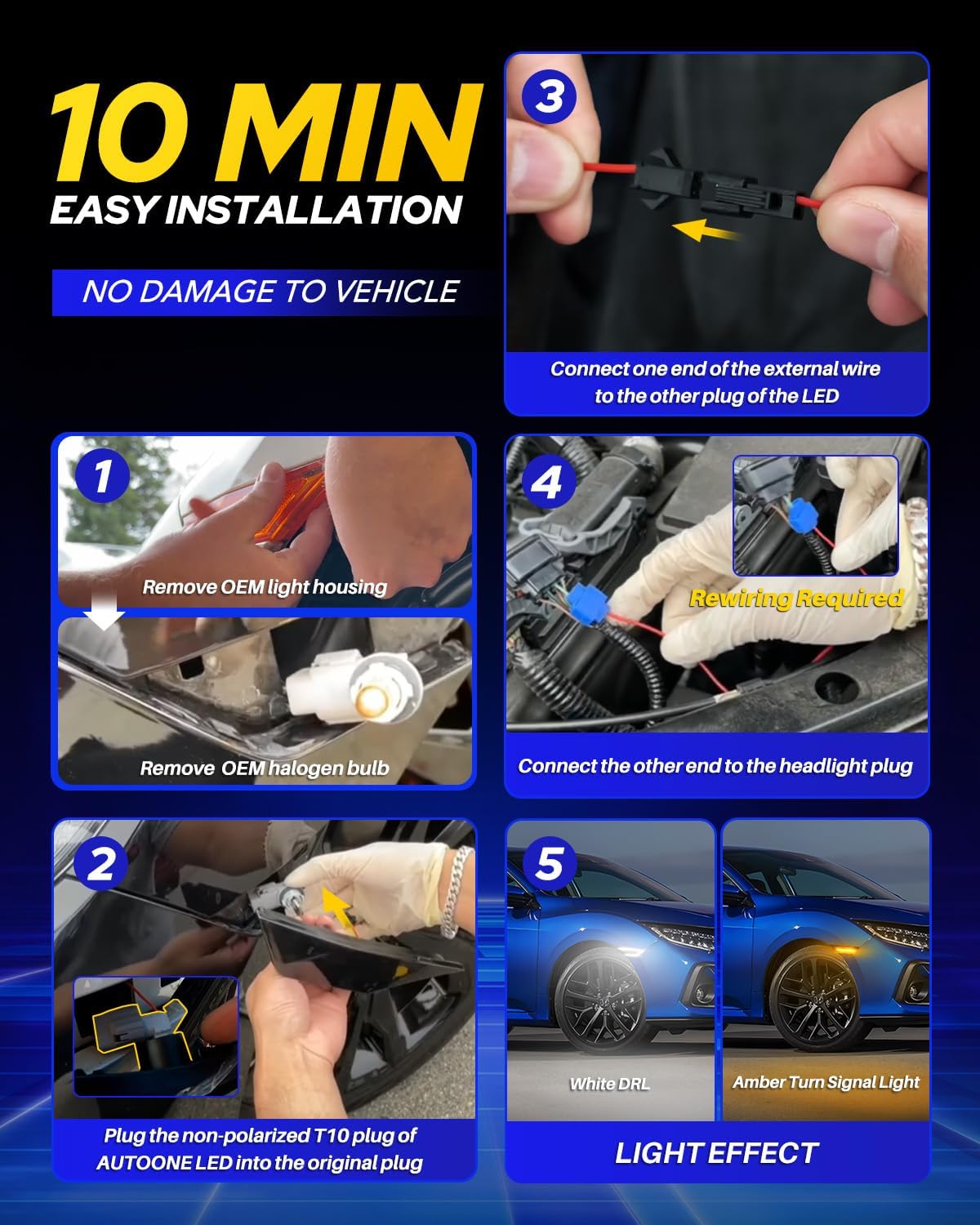【Longer Lifespan】: Crafted from high-quality materials, AUTOONE Switchback LED side marker light kit provides exceptional durability and resistance to harsh weather conditions, the LED bulbs have a longer lifespan compared to traditional halogen bulbs, ensuring reliable performance and reduced maintenance, making it ideal for long-term use on your vehicle. ensuring reliable and consistent performance for years to come.