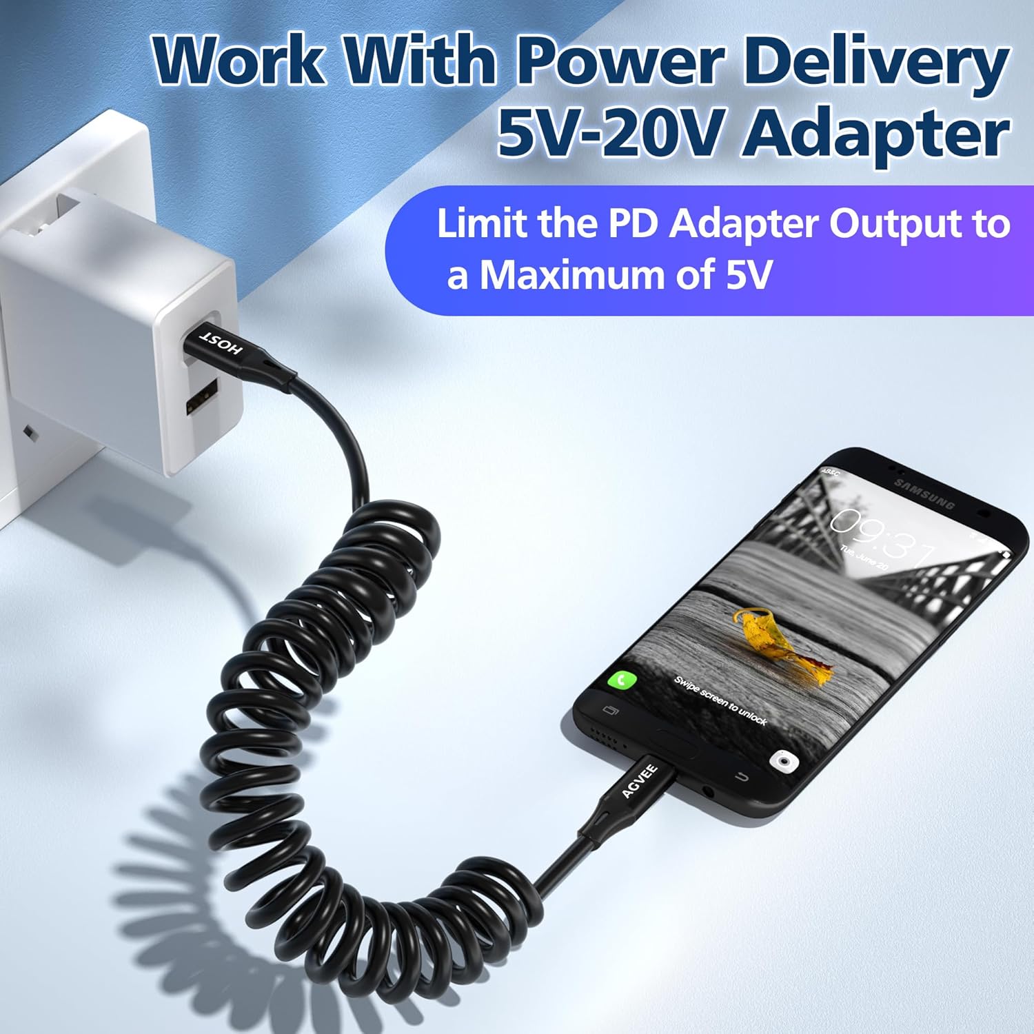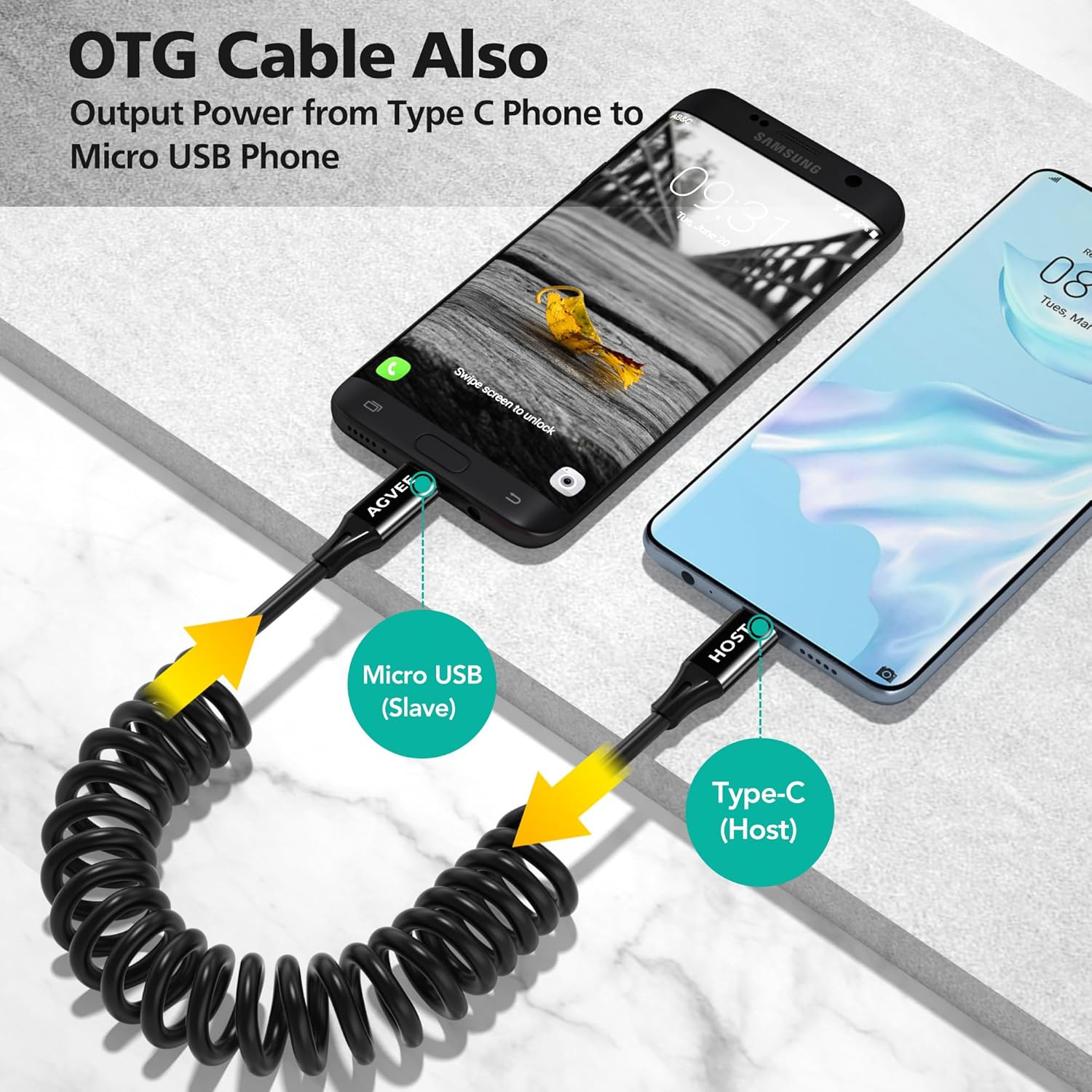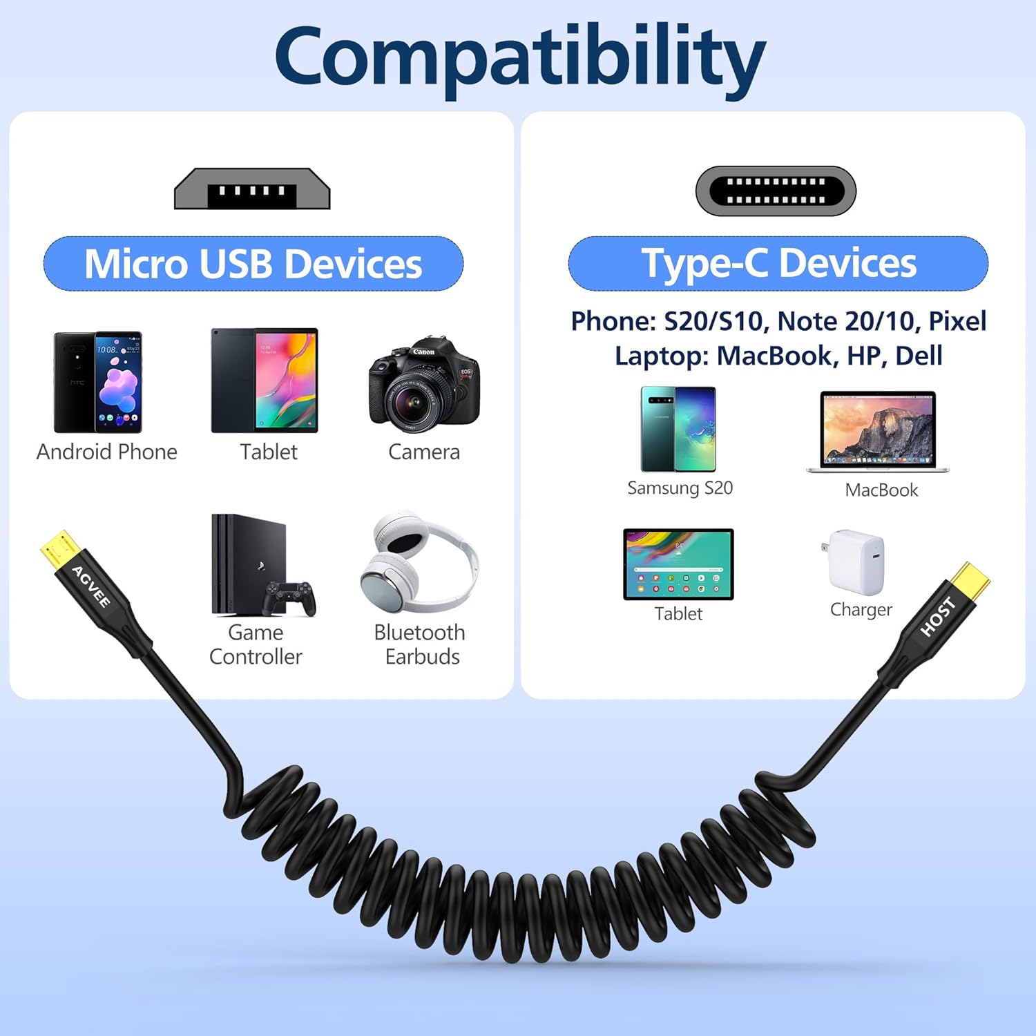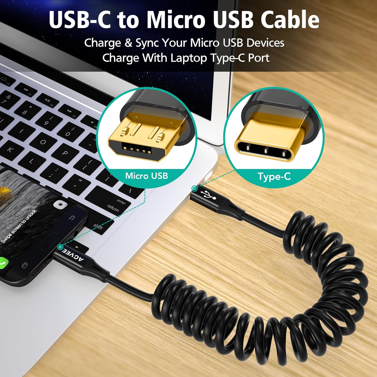 ⭕AGVEE Coiled USB-C to Micro USB Cable: USB-IF Certified, Fast Charging & Tangle-Free Design for Car & Home Use