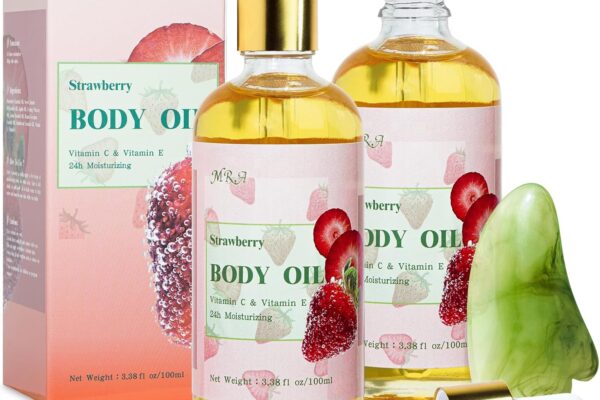 MR.A 2 Pack Strawberry Body Oil Juice Scented, Vitamin E Body Oil after Shower, Strawberry Shortcake Body Moisturizer Bath Oil for Dry Skin, Guasha Oil with Guasha Tool
