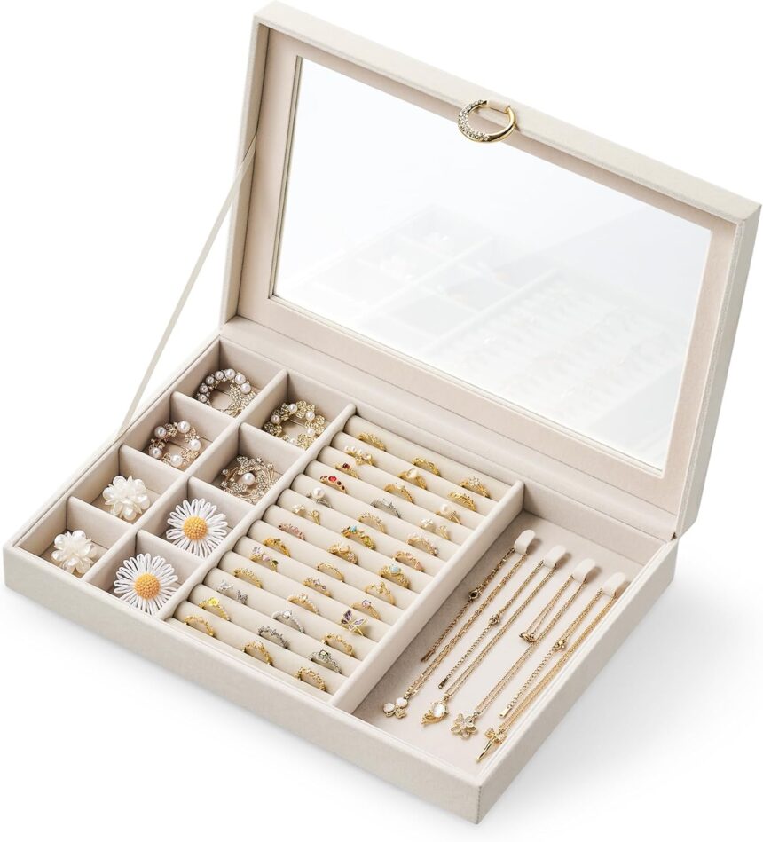 bussdis Glass Lid Jewelry Organizer Box – Beige Velvet Jewelry Case with Ring Slots, Necklace Hooks & Removable Compartments for Earrings, Rings & Bracelets