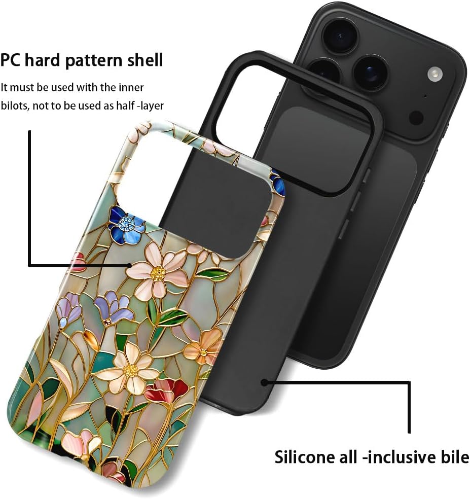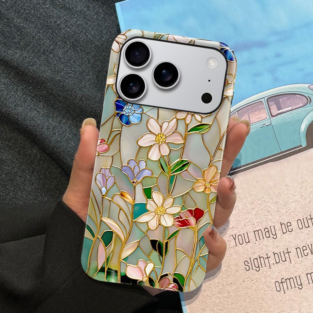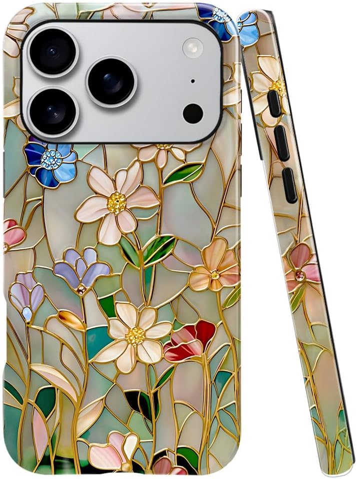Case Compatible with iPhone 17 Pro,Fall Prevention Bright Hybrid 2-Layer Hard Shell Phone Case for Girls Boys,Stained Glass Bloom Flower