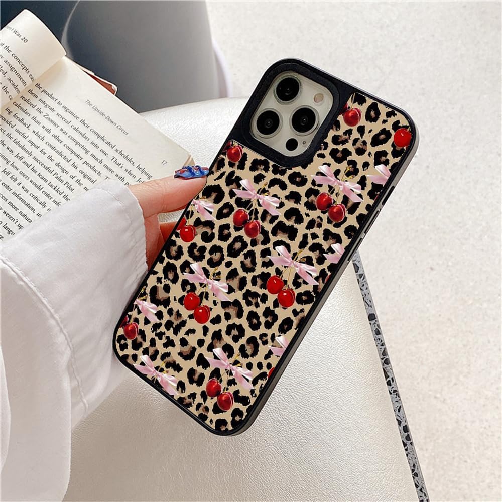 Case for iPhone 16 Pro Max, Trendy Aesthetic Leopard Cherry Bow Pattern Print, Glossy Hard PC Back Soft TPU Bumper, Slim Shockproof Anti-Scratch Cover for Teen Girls Women