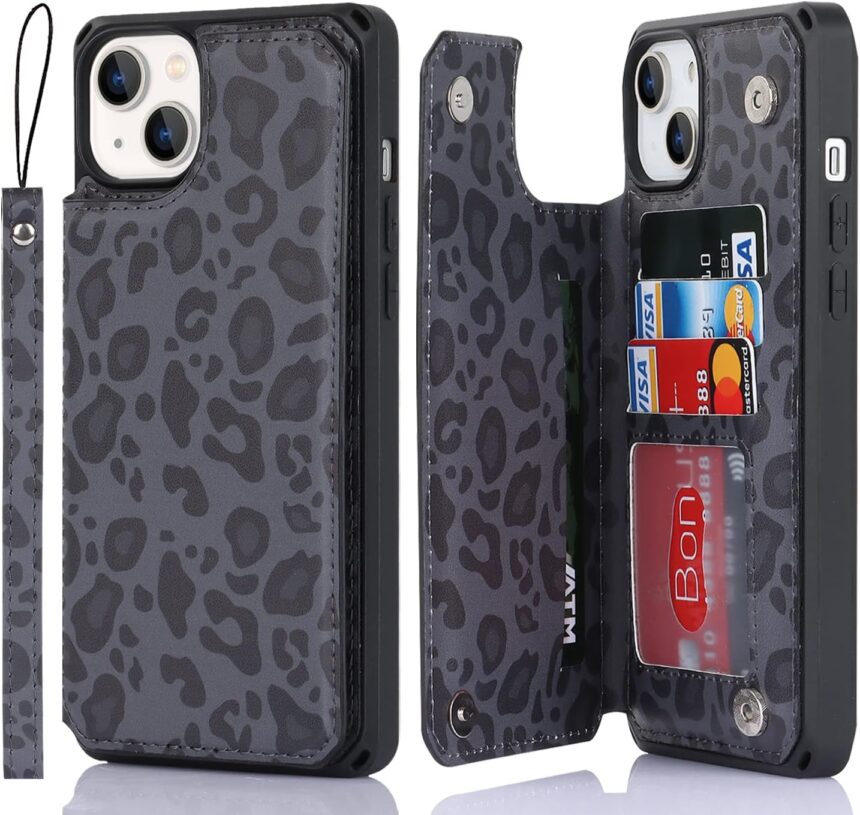 Cavor for iPhone 14 Case with Card Holder, Wallet Case for Women Men, for iPhone 14 Phone Case Cute with Stand & Strap,Leopard Grain Shockproof Protective Credit Cards Cover-Black