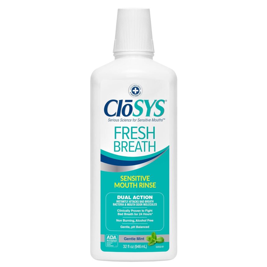 CloSYS Mouthwash, 32 Ounce, Fresh Breath Mouthwash, Gentle Mint, Alcohol Free, Dye Free, pH Balanced Mouth Wash, Helps Soothe Entire Mouth, Fights Bad Breath