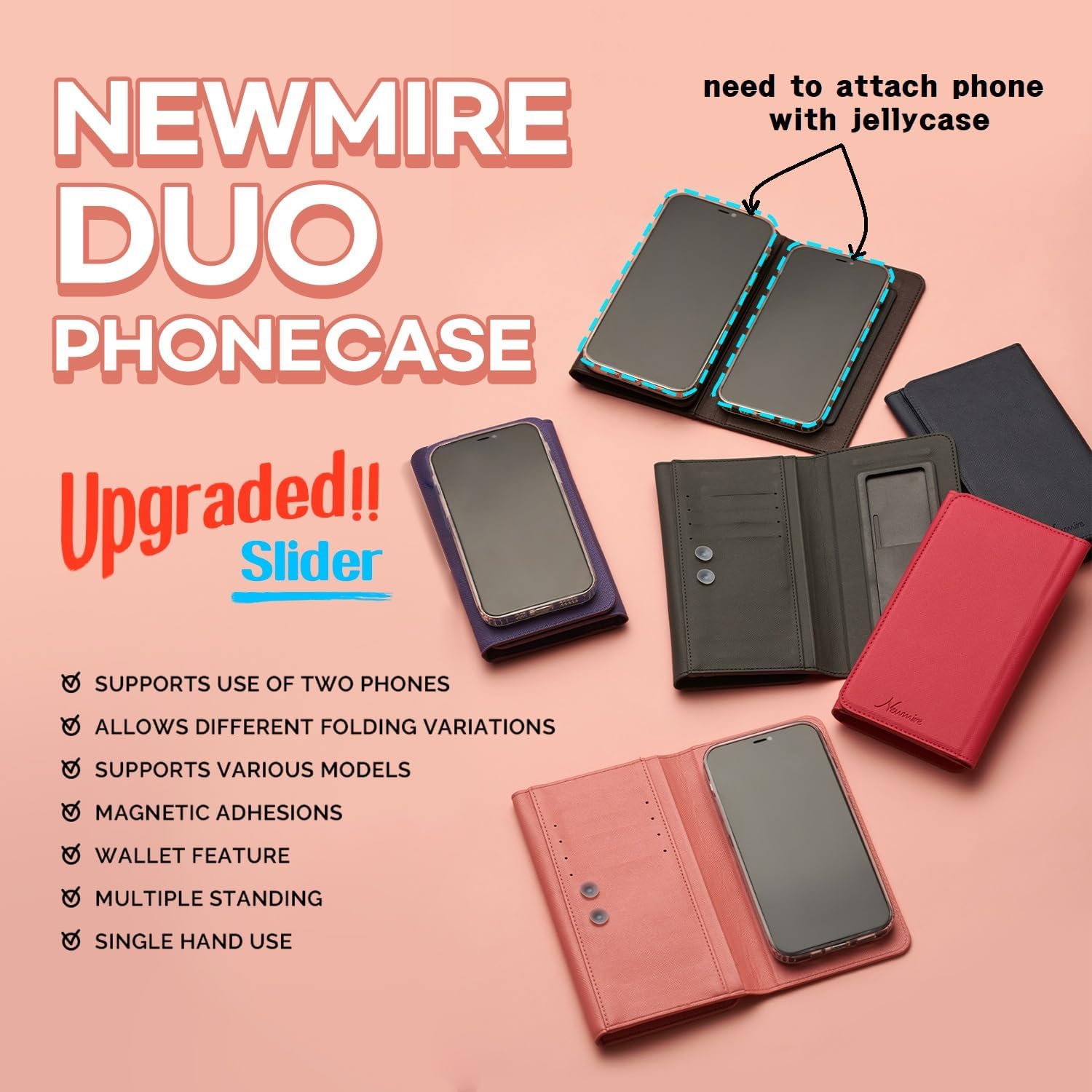 The “NEWMIRE DUO PHONECASE” is compatible with old and new models, including the iPhone Max, Galaxy Note, and all other large-sized models. You can use it for all cellphone models that are smaller than the one-sided size of the case’s body.