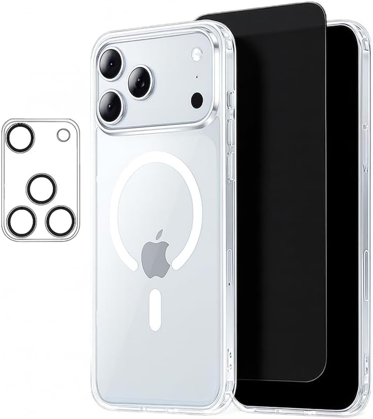 Protect your new iPhone 17 Series with this complete 3-in-1 protection bundle. Designed for a perfect fit, this set includes a magnetic clear case, a privacy tempered glass screen protector, and durable camera lens protectors. The slim clear case keeps your phone’s original design visible while providing military-grade drop protection and anti-yellowing durability. The privacy screen protector shields your display from prying eyes while maintaining smooth touch sensitivity and HD clarity. The tempered glass and lens protectors add an extra layer of defense against scratches, drops, and daily wear — without compromising photo or video quality. Easy to install with the included tools, this bundle gives your iPhone 17, iPhone 17 Pro, or iPhone 17 Pro Max all-around protection with style and reliability.