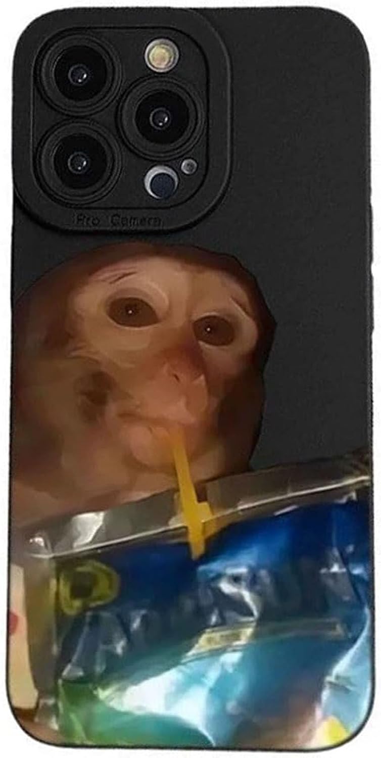JDIV Monkey Phone Case, Funny Monkey Drinking Capri Sun Phone Case Compatible for iPhone 16/15/14/13/12/11 Promax (Black-A,14)