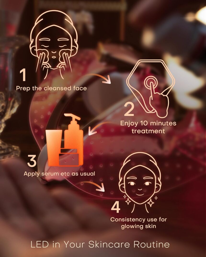 The NEWKEY Face Pro can be used day or night, ideally after cleaning as certain skincare and makeup can block the LED light from entering the skin. After the treatment is complete, follow with your daily skincare products of choice.