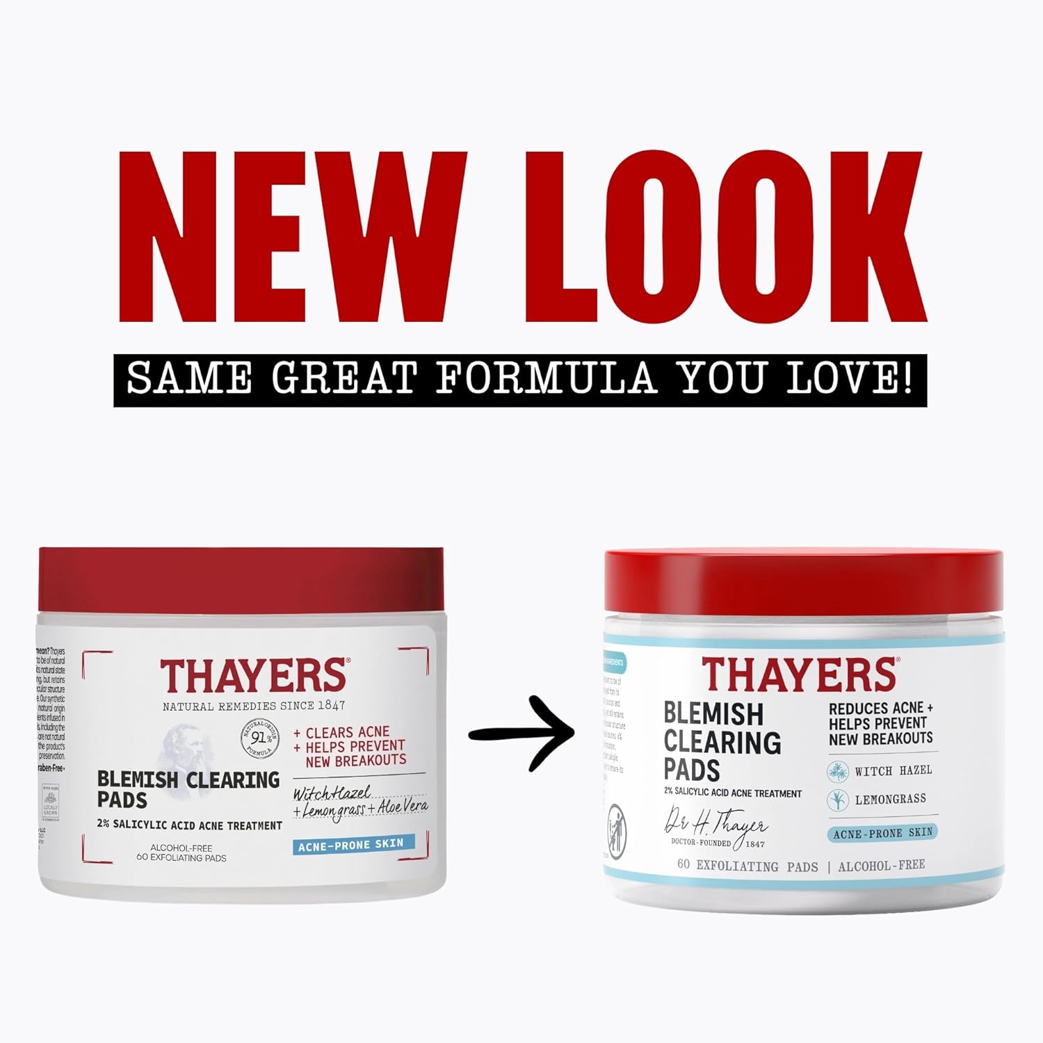 Thayers Blemish Clearing Acne Pads, Salicylic Acid Acne Treatment for Face, Pore Reducing, Exfoliating, and Soothing Skincare, Witch Hazel Toner Pads, 60 Ct