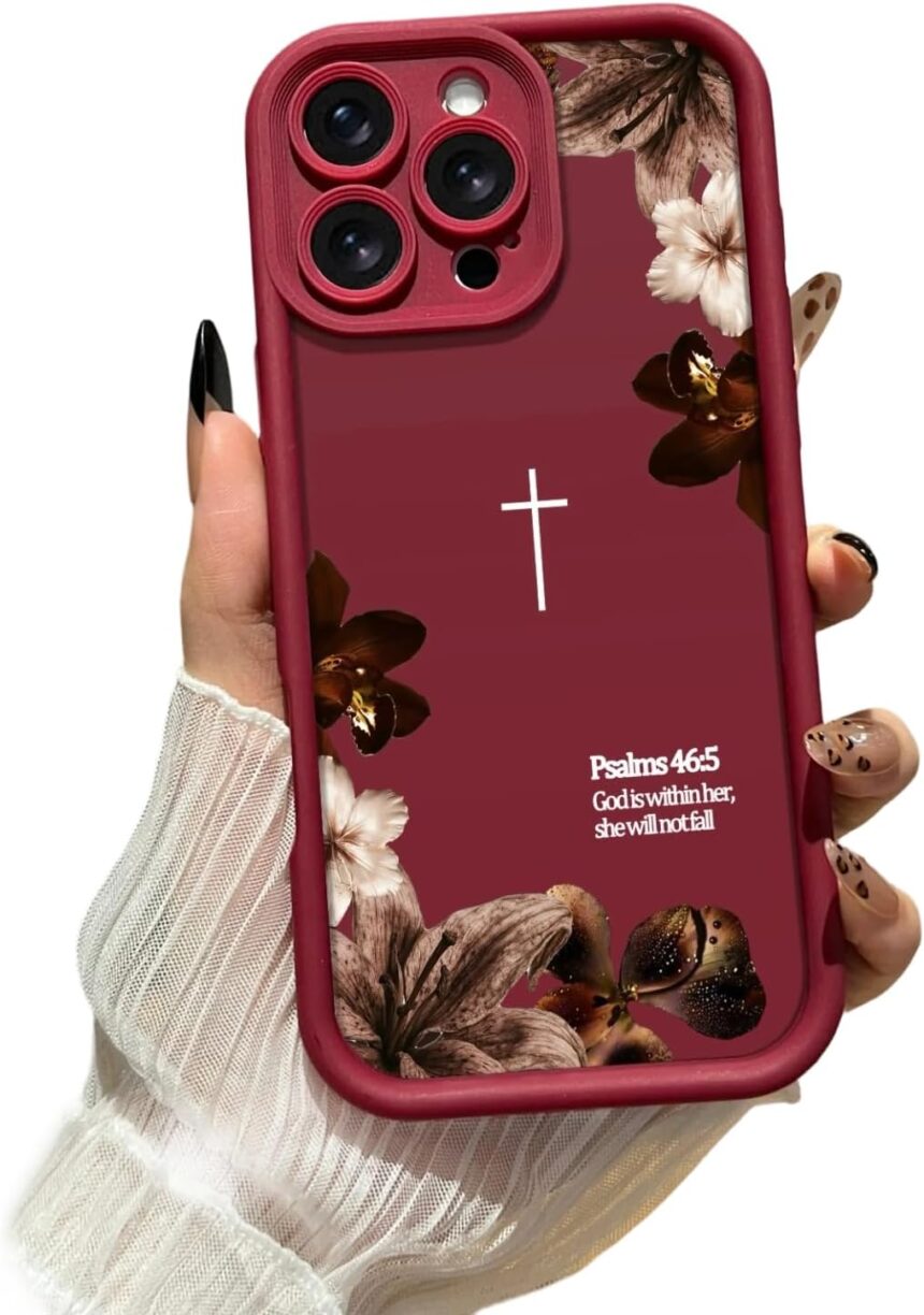 Vintage Floral Lanyard Phone Case Christian Psalms 46:5 Cross,Compatible with iPhone 16 Pro Max, Matte Anti Drop Bumper Religious Birthday Gift for Her-Burgundy