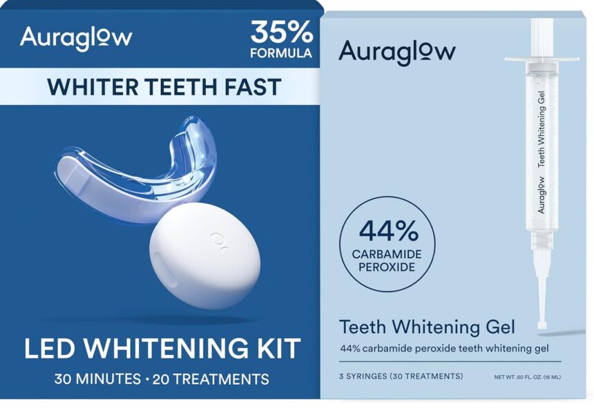Auraglow Teeth Whitening Kit with LED Light & Extra Strength 44% Carbamide Peroxide Teeth Whitening Gel Refill, 30+ Treatments, Whiten Up to 10 Shades