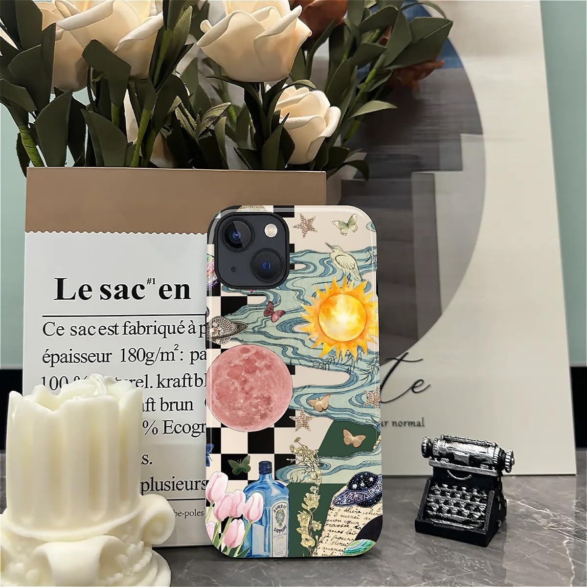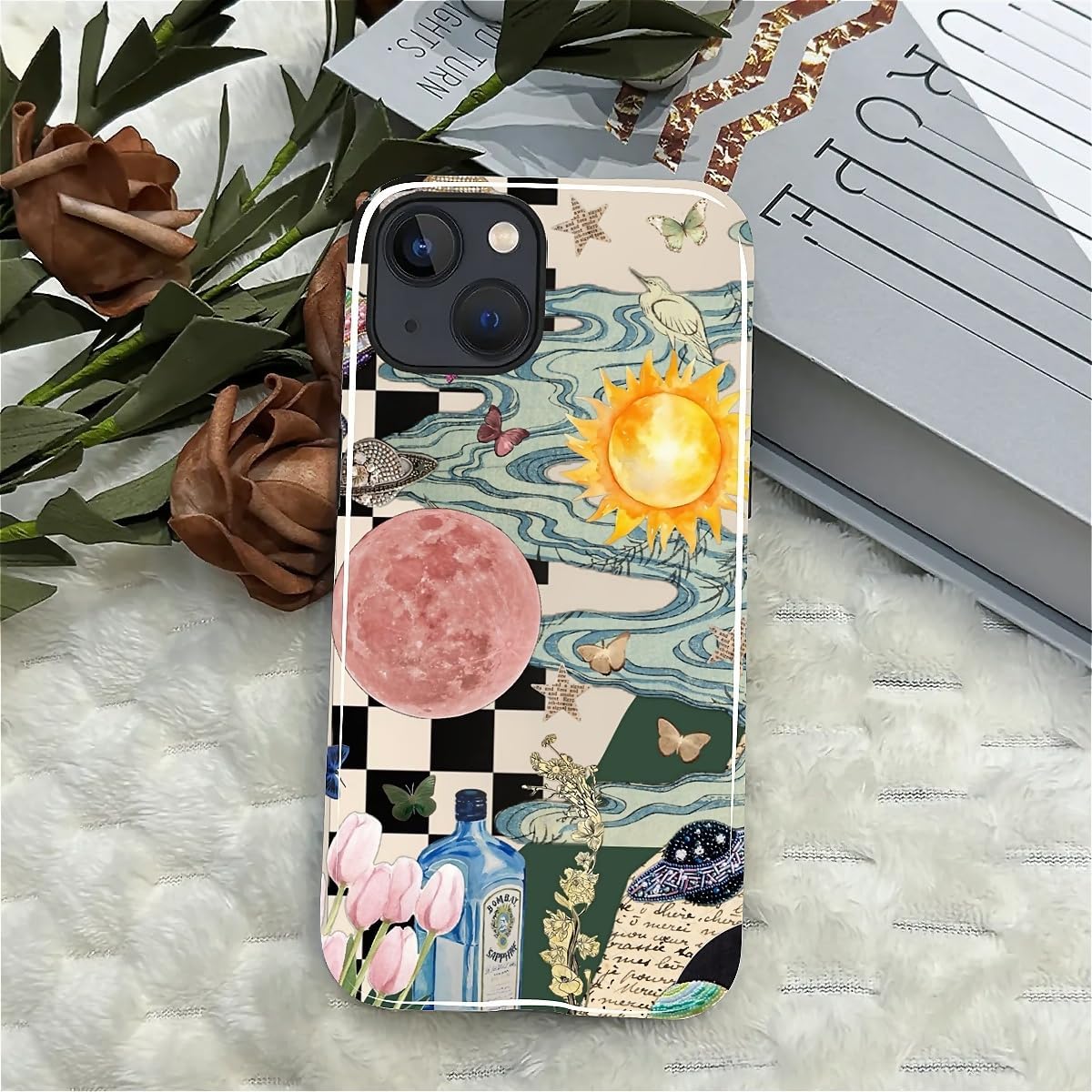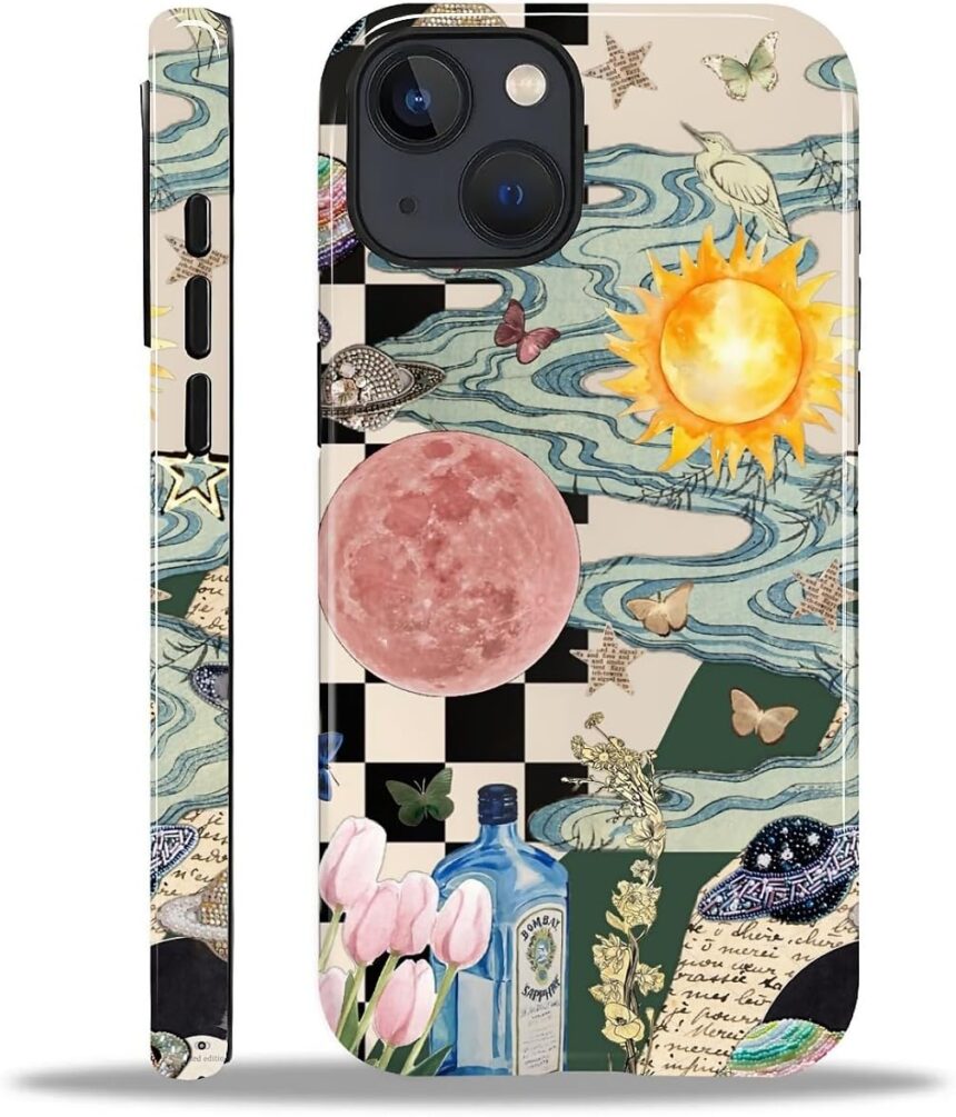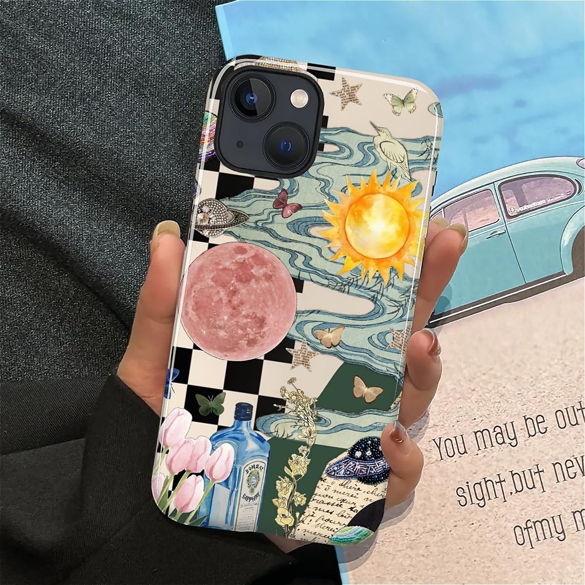 Compatible with iPhone 15 Plus Case – Hybrid Heavy Duty 2 in 1 Full Body Rugged Shockproof Protection Glossy Case for iPhone 15 Plus – Aesthetic Collage Moon and Sun