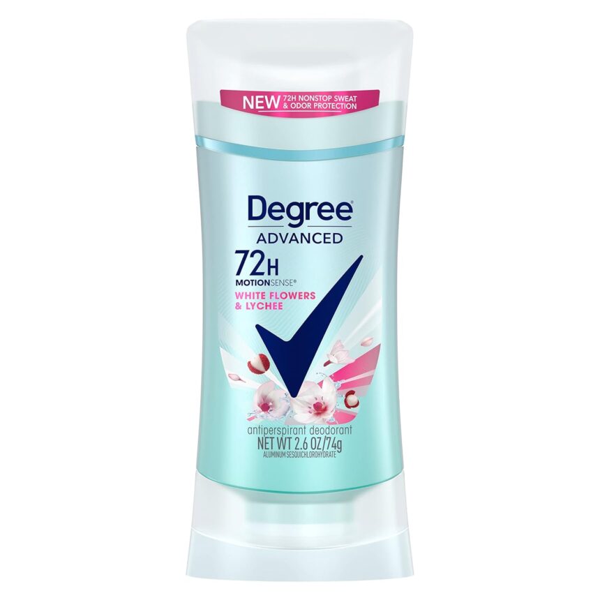 Degree White Flowers & Lychee Advanced Protection Antiperspirant Deodorant delivers nonstop protection so you can face the day with confidence. This antiperspirant for women features 72-hour sweat and odor protection and the fruity, floral scent of lychee and white flowers. Only Degree has Body Heat Activated technology that moves in sync with your body. This antiperspirant deodorant releases a burst of subtle fragrance every time you move, for nonstop protection. Degree White Flowers & Lychee Advanced Protection Antiperspirant Deodorant keeps you feeling fresher, drier, and more confident. This powerful antiperspirant deodorant responds when needed most, so you don’t have to worry about slowing down. Simply swipe and start moving. This antiperspirant deodorant for women with a refreshing scent gives you the confidence to keep moving all day long. Degree White Flowers & Lychee Advanced Protection Antiperspirant Deodorant provides a fresh, cool feeling while protecting you from sweat and odor. It gives you the confidence to keep moving, however you move. White Flowers & Lychee also comes in an antiperspirant deodorant dry spray. At Degree, we’re doing everything possible to help keep the planet moving. That’s why we’re increasing our use of reusable materials, making it easier for you to recycle our antiperspirant and dry spray packaging. Whatever you do, however you do it, Degree wants to help inspire the confidence in you to move more, and with this antiperspirant deodorant. It’ll give you the confidence that sweat and odor will not get in the way of your progress. Degree. It won’t let you down.