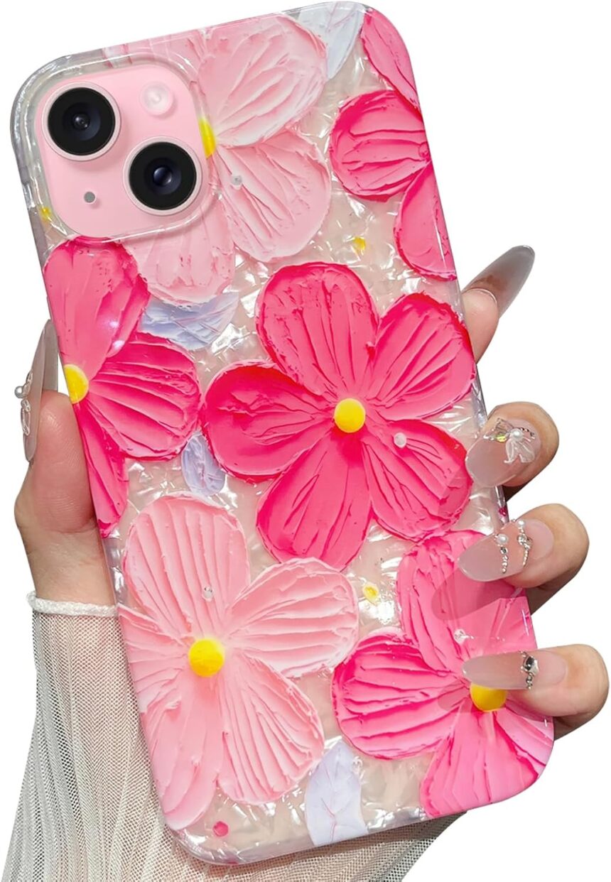 for iPhone 15 Plus Case Flowers Women Girly Aesthetic Sparkle Translucent Cute Floral With Phone Strap Charms Wristlet Oil Painting Shockproof Protective Phone Cases for iPhone 15 Plus Hot Pink
