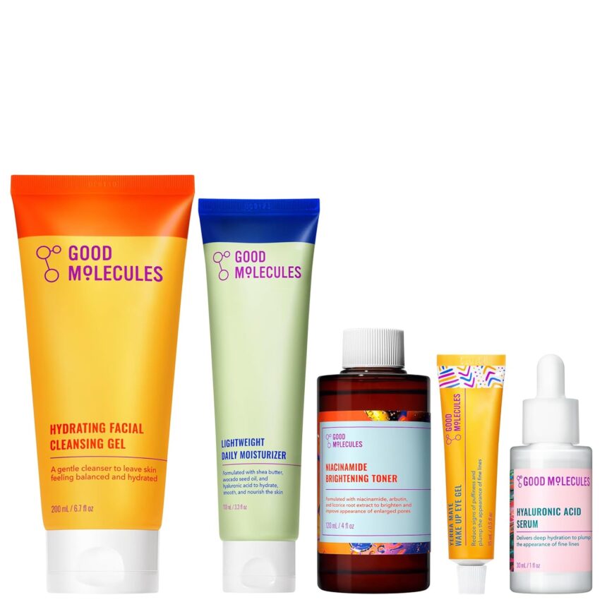 Good Molecules Daily Skincare Routine Set with Hydrating Cleanser, Niacinamide Toner, Hyaluronic Acid Serum, Moisturizer, Eye Gel, 5 Pieces