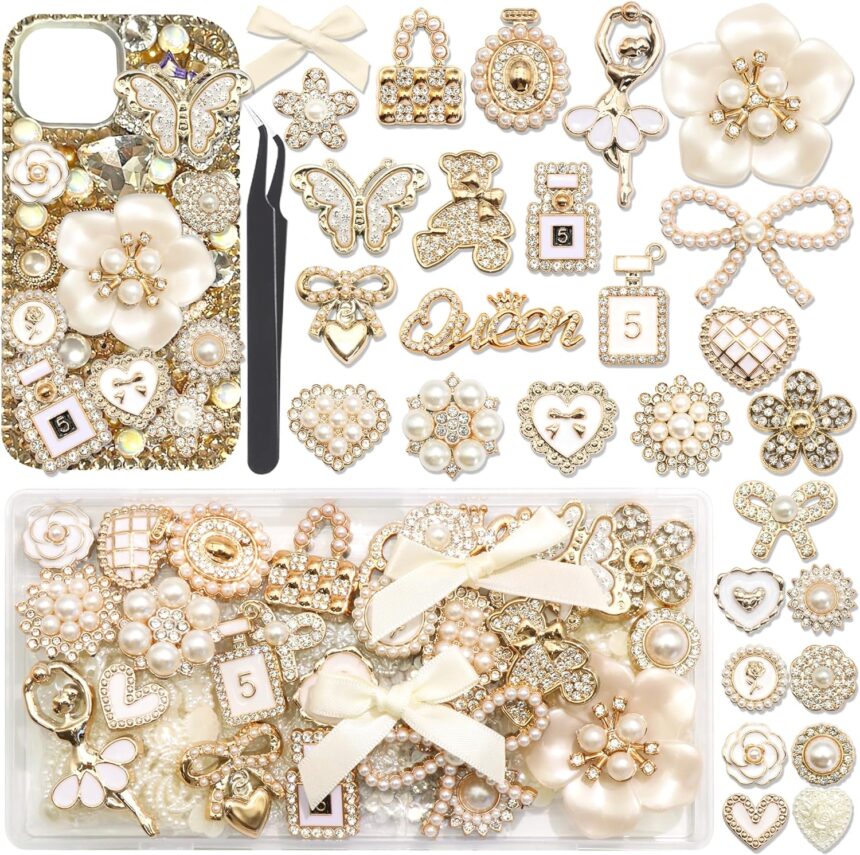 Content: Our junk case kit includes a tweezers, 38 big flatback charms, a bag of small white charms, a bag of different size flatback pearls, a bag of transparent flatback rhinestone.