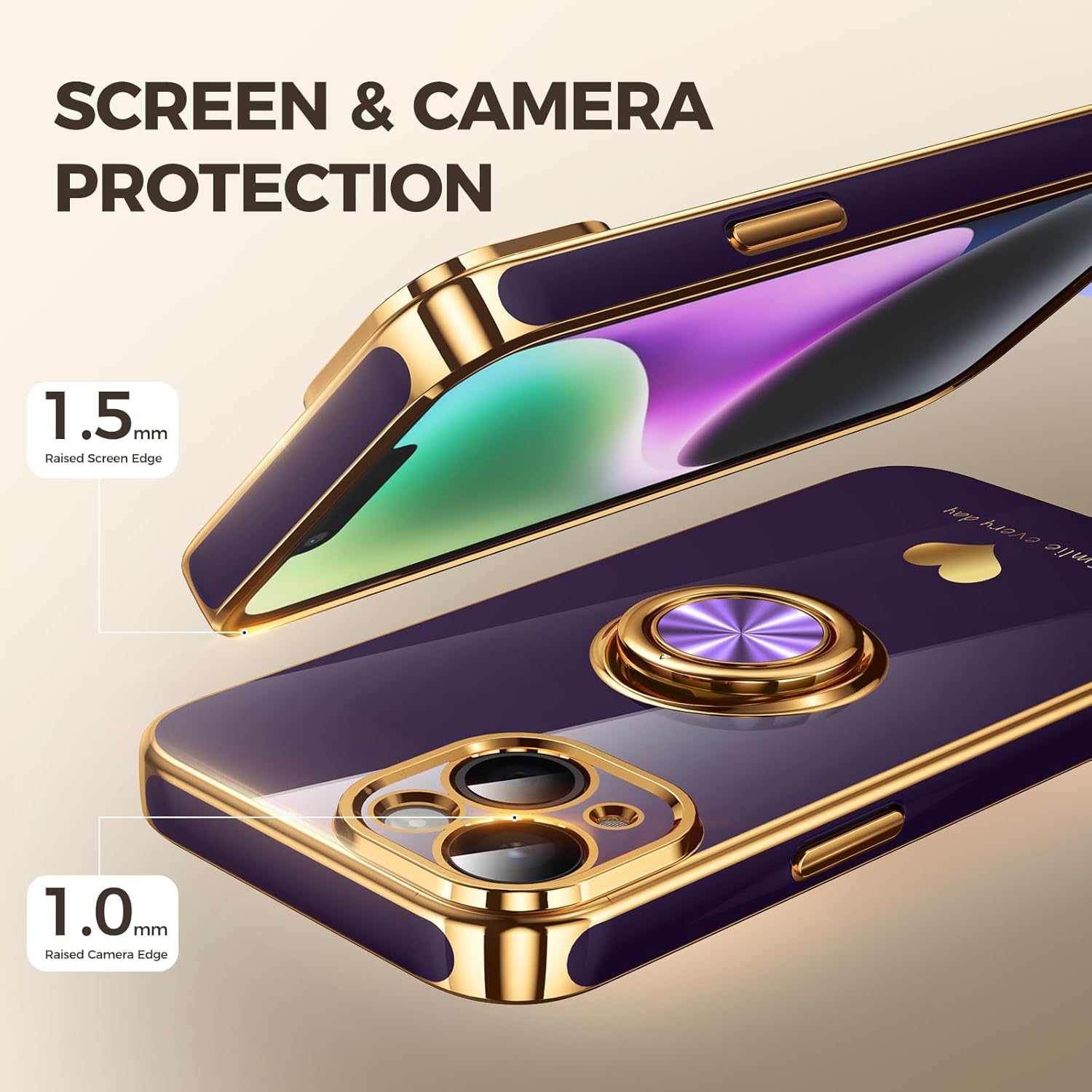 💕【Elegant Design】 With electroplated gold edges, a 360° rotatable ring stand,stylish and cute gold electroplatedheart motif and the text ‘Smile Every Day’ combined into one, this case adds elegance and glamour to your phone. Satisfy your need for luxury and fashionable taste in cases. Slim and lightweight, not bulky and easy to hold.