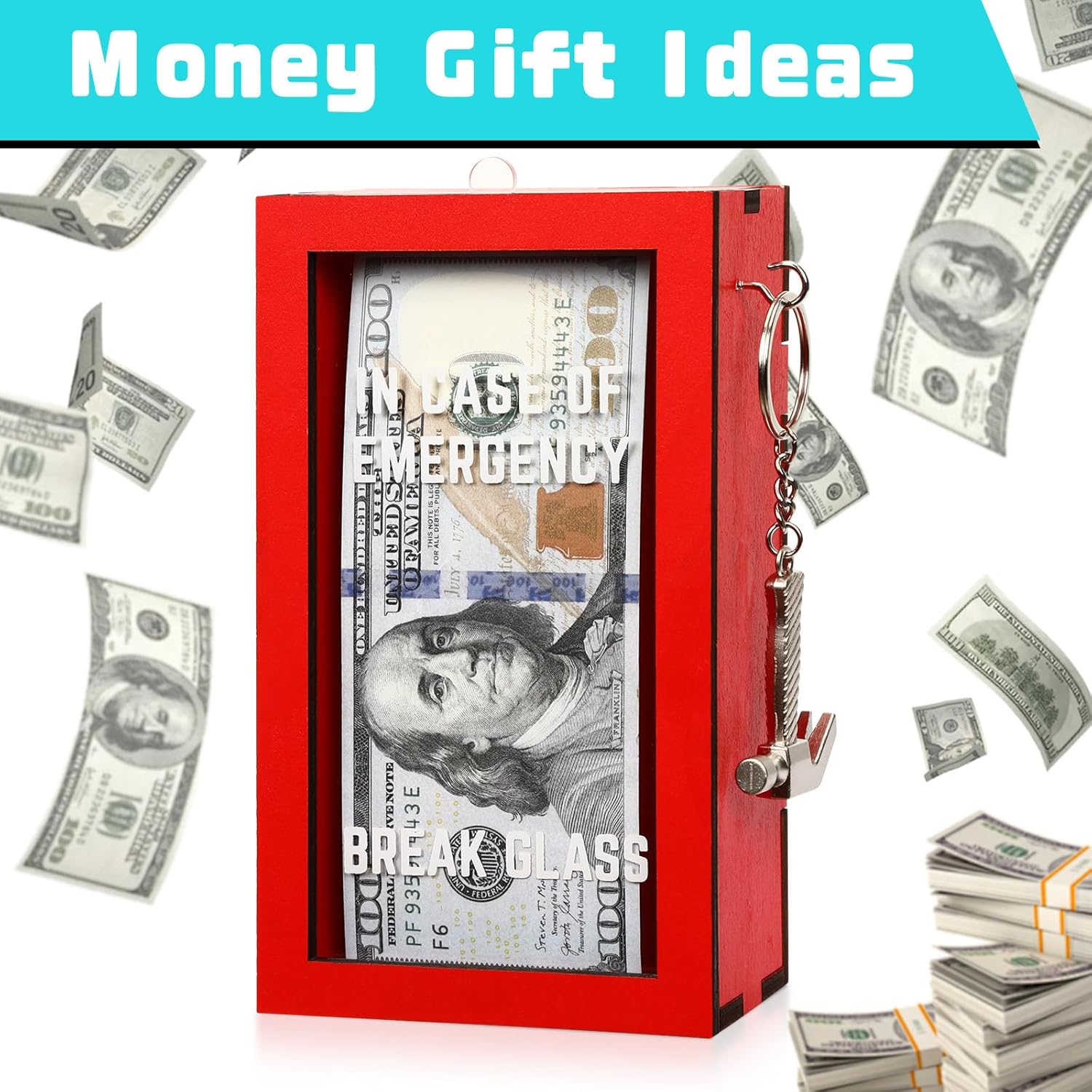 Fun to Personalized: The box is coated in red color and the front glass reads “IN CASE OF EMERGENCY” | “BREAK GLASS”, humorously emphasizing the urgency of the situation. It comes with a novelty metal hammer chain. And the back easily opens so you can make this gift complete by adding your own items.