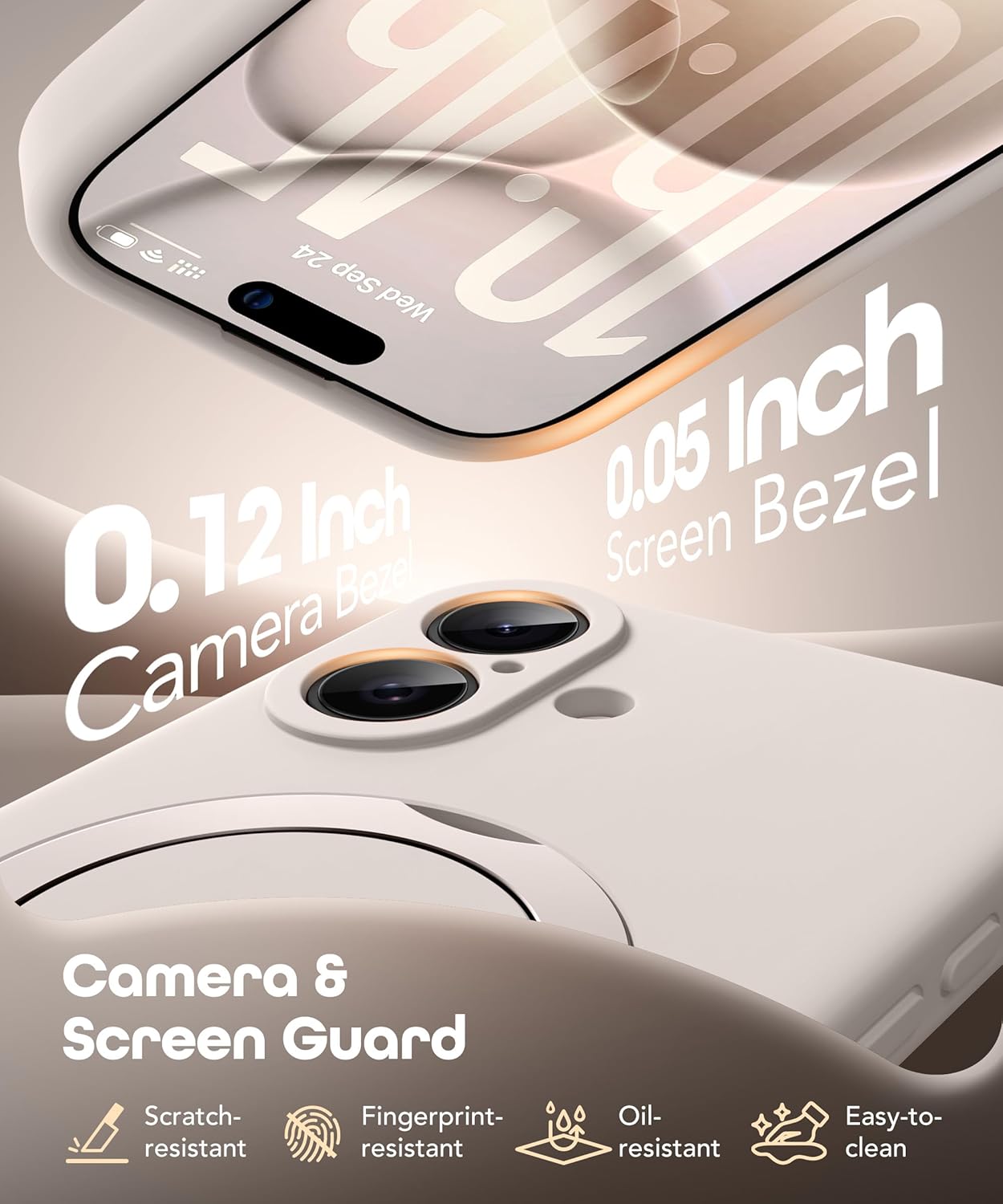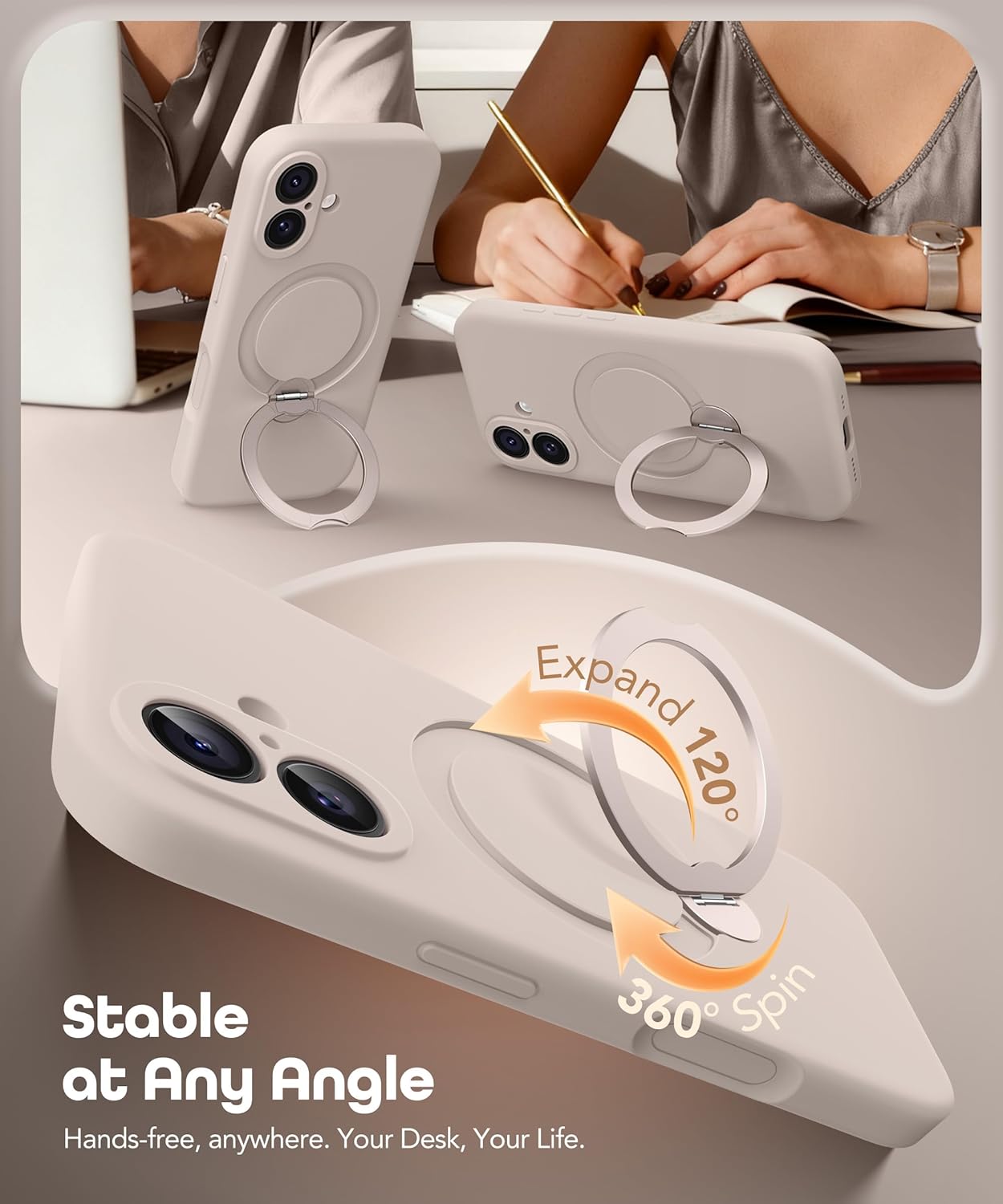 Built-in 360° Spin Durable Stand : Built-in 360° Rotating Durable Kickstand: This iPhone 17 case integrates magnets, 360° rotation, and a ring-shaped kickstand. Made from aircraft-grade aluminum alloy, the kickstand easily folds, rotates freely, and locks securely. It expands at multiple angles, ensuring a sturdy and stable fit in either portrait or landscape orientation, while remaining slim and portable.