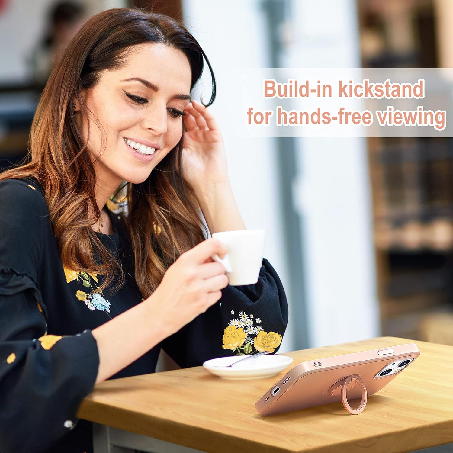 UPDATE – KICKSTAND DESIGN: The 360 degree rotatable built-in ring holder makes easy to hold the phone and works well as a stand to prop up the phone. The ring on the back also helps assist with drop prevention. And it is suitable for car magnetic mount