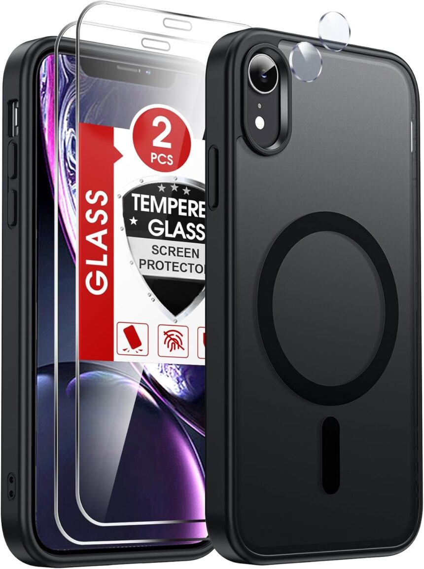 【5-in-1 Full-Armor Defense Kit for iPhone XR】Magnetic iPhone XR phone case absorbs shock from daily drops, 2X 9H screen protector defends against scratches and cracks, and 2X iPhone XR camera covers protect the lens from shattering. Love the convenience of all on one kit for your iPhone