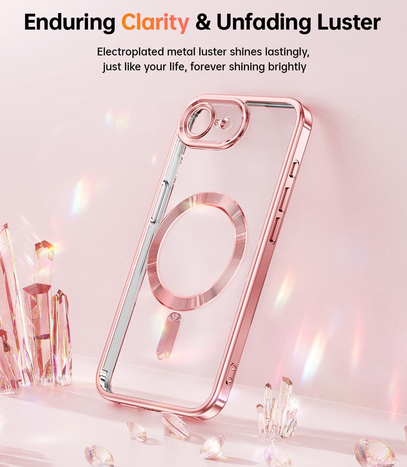 METALLIC GLOSSY & CRYSTAL CLEAR: While maintaining the transparent back, the edges, camera, and magnetic ring are embellished with a metallic luster, making this case truly unique. The designed for MagSafe iPhone 17e/16e Case combines advanced technologies to preserve the stunning clarity of your iPhone. With its German optical Say goodbye to unsightly yellowing and enjoy a case that always looks as good as new