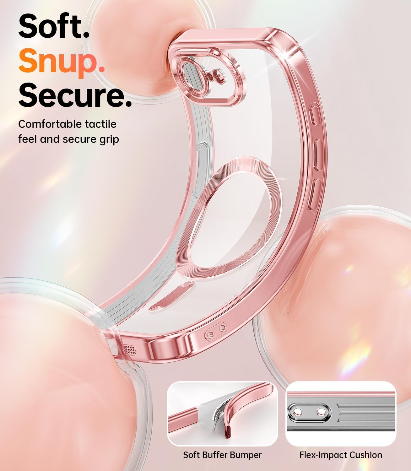 Transparent and metallic pink smartphone cases with impact-absorbing corners. Features include flexible material, cushioned edges, and precise cutouts for ports and buttons.Transparent and metallic pink smartphone cases with impact-absorbing corners. Features include flexible material, cushioned edges, and precise cutouts for ports and buttons.