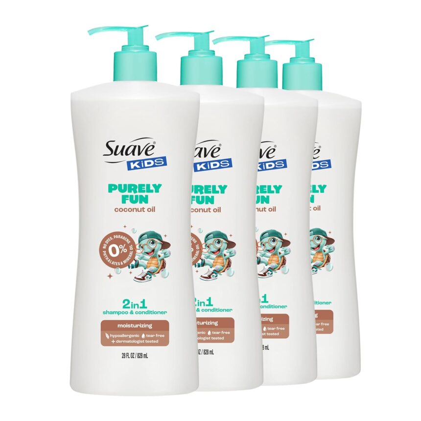 Suave Kids Purely Fun 2 in 1 Shampoo and Conditioner with Coconut Oil, Tear-Free, Hypoallergenic, Gentle Hair Care for Kids with Sensitive Scalps, 4 Count, 28 FL OZ