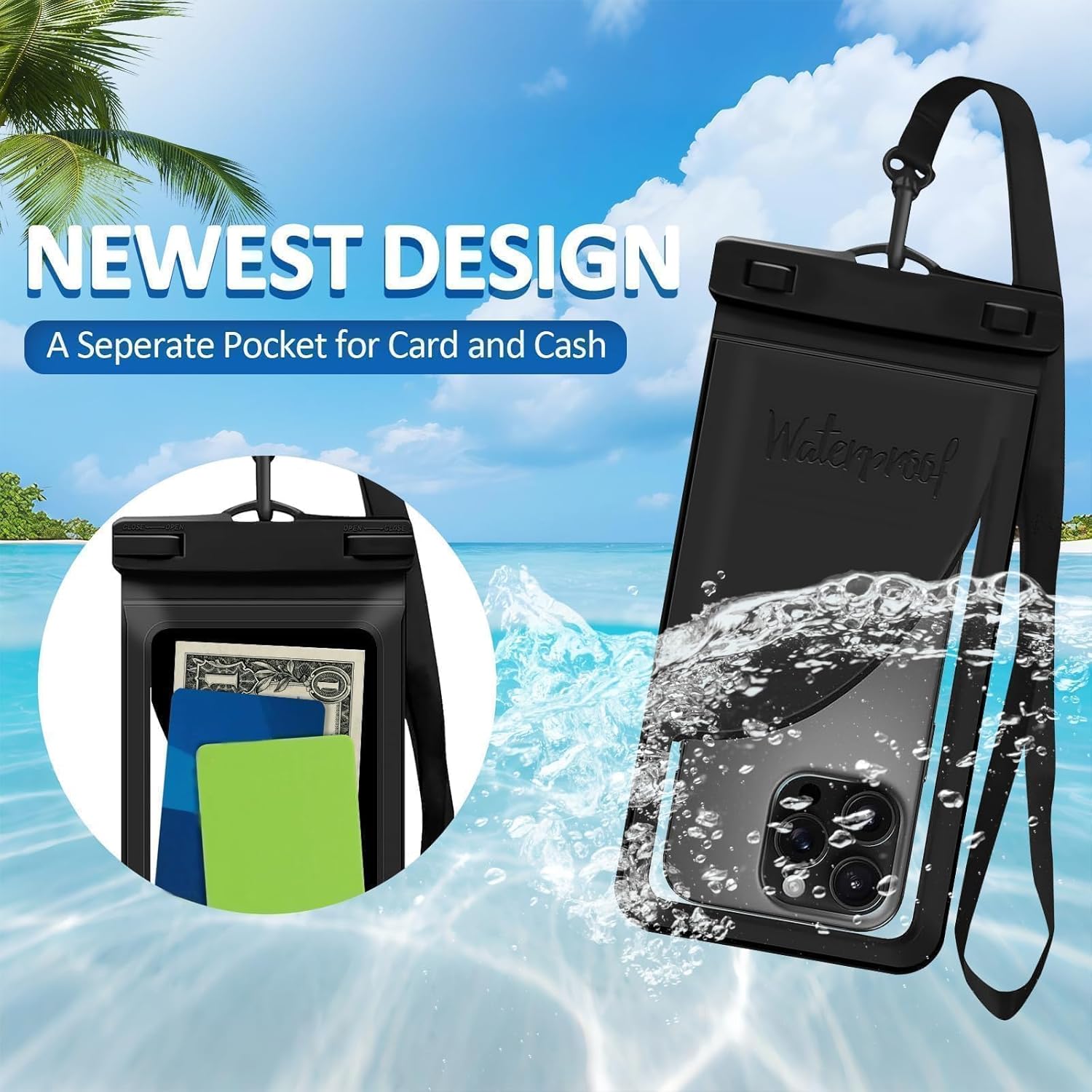 Waterproof Phone Pouch, with Interior Card Pocket, Large Waterproof Phone Case for iPhone 17 16 15 14 Pro Max, IPX8 Lightweight Cellphone Dry Bag, Beach Cruise Ship Essential,1 Pack-Black-8.3″