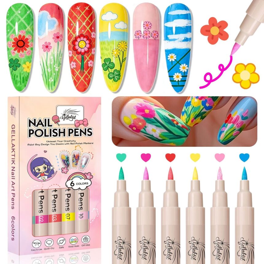 6 Colors Nail Art Pens Set, 3D Nail Polish Pens Quick-Drying Acrylic Paint Markers, Dotting Liner Brush for DIY Nail Design, Home & Salon Manicure Tools