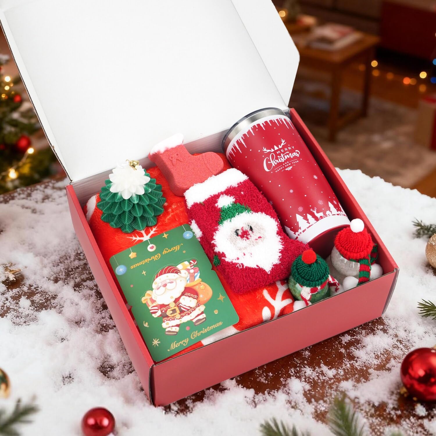 Christmas Gift Sets For Women: Every detail whispers Christmas magic! The elegant Christmas tree candle fills the room with a festive scent, while the classic Santa hat adds playful fun. These thoughtful touches create unforgettable holiday memories for her