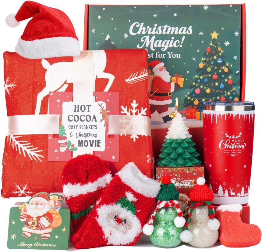 Womens Gifts For Christmas: Wrap her in warmth and holiday cheer! Our ultra-soft 50″x59″ Christmas blanket and festive socks are perfect for cozying up by the tree. The 20oz insulated tumbler with a festive design keeps her cocoa warm, creating the perfect cozy Christmas moment