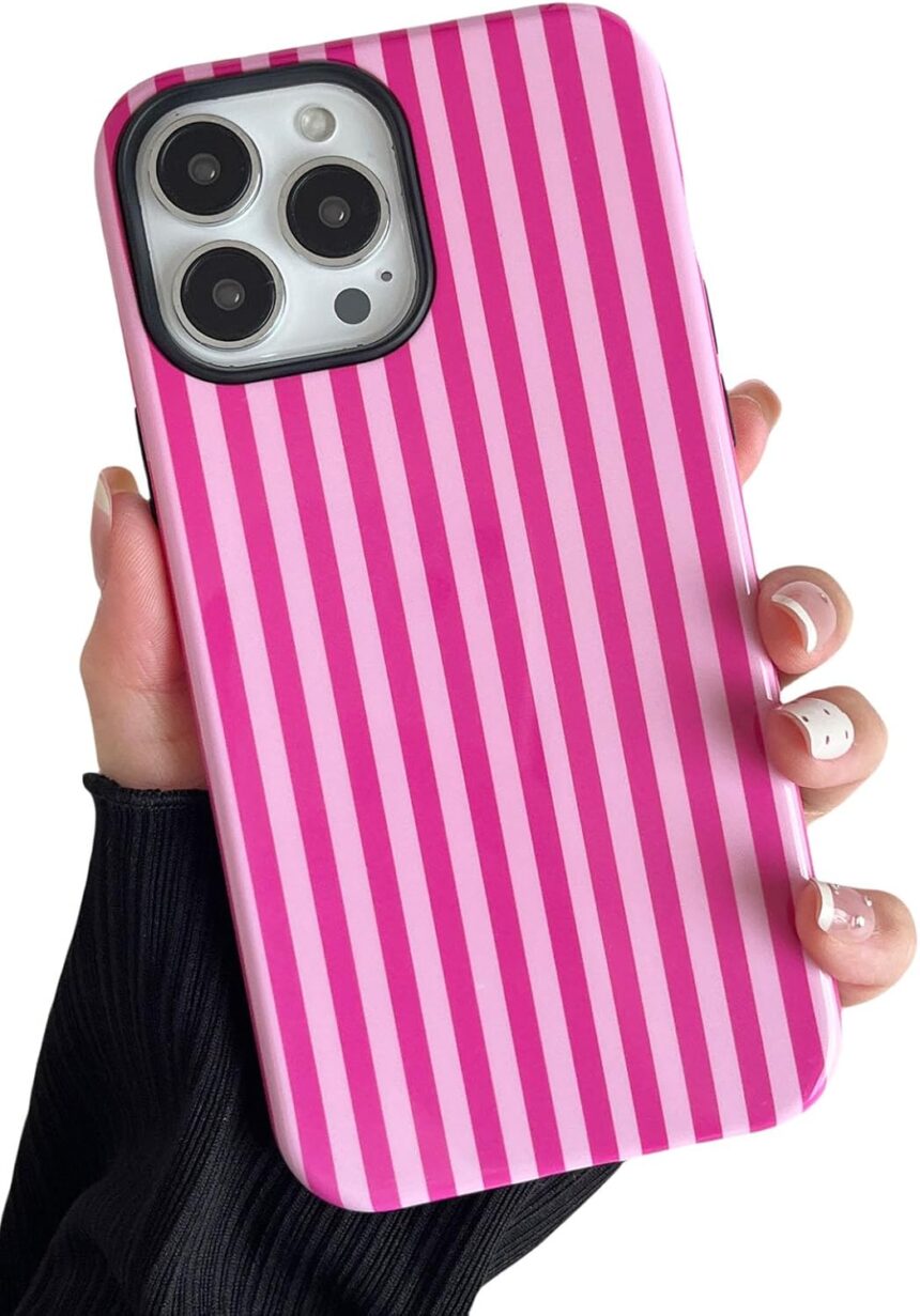 Longlayss Compatible with iPhone 15 Pro Max Case Cute Aesthetic Striped Phone Case for Women Girl Shockproof Slim TPU and Hard PC Protective Cover (Hot Pink)