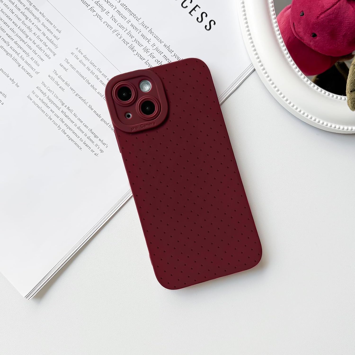 NITITOP Compatible with iPhone 15 Case Cute Aesthetic Little Polka Dots Pattern Design for Women Men Girls Soft TPU Shockproof Stylish Full Camera Protective Phone Cover – Wine Red