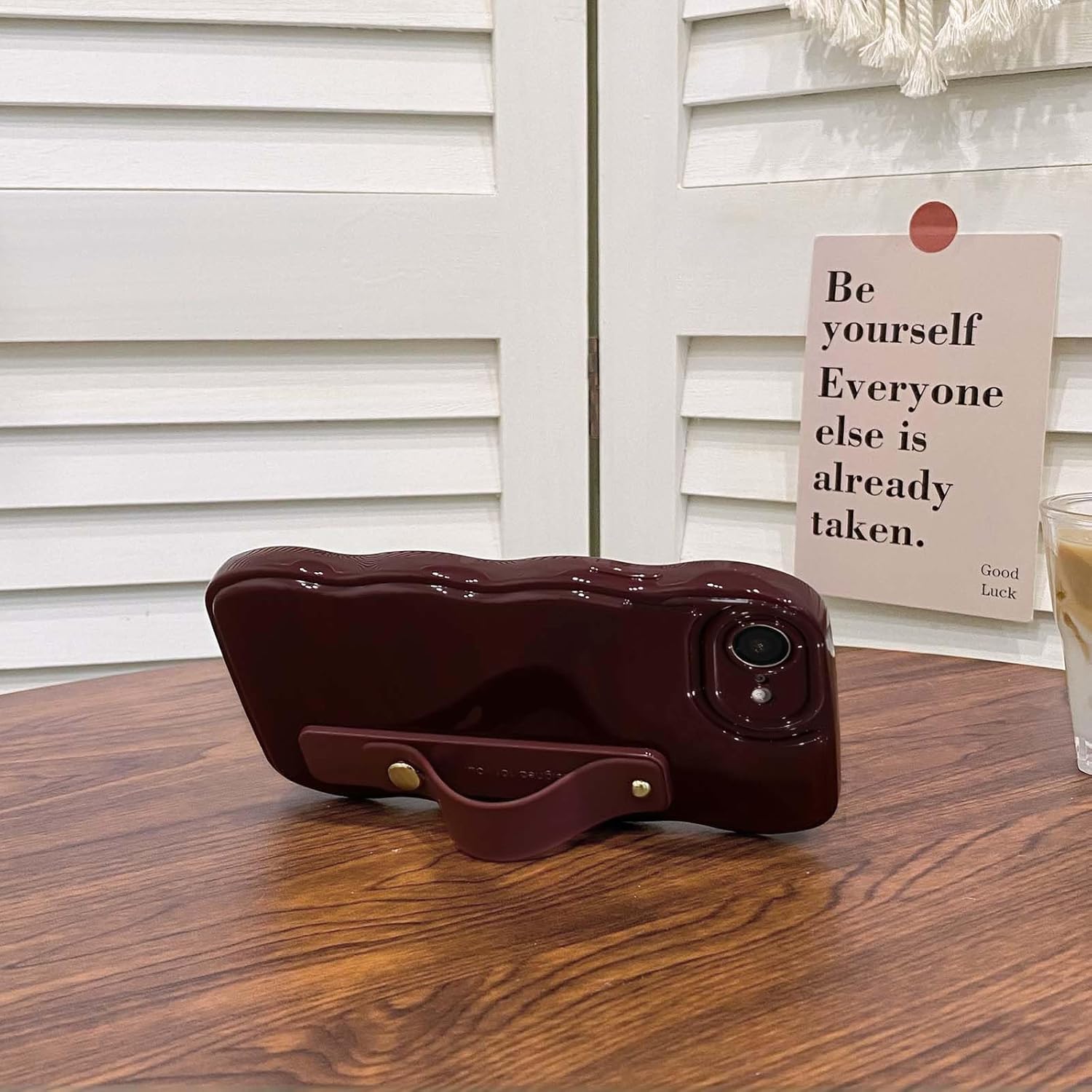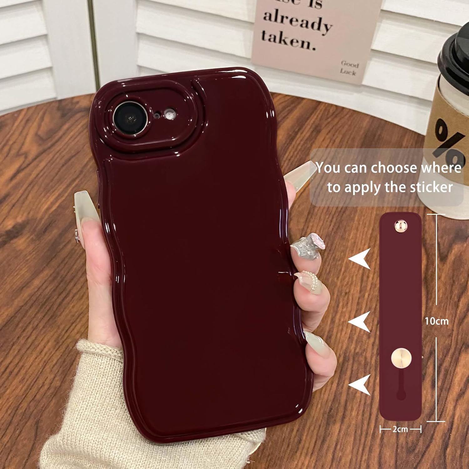 NITITOP Compatible with iPhone 16e Case Cute Simple Wave Design Stylish Wavy Curly Frame with Wrist Adjustable Hand Strap Kickstand Grip Holder Soft Silicone Protective Cover – Wine Red