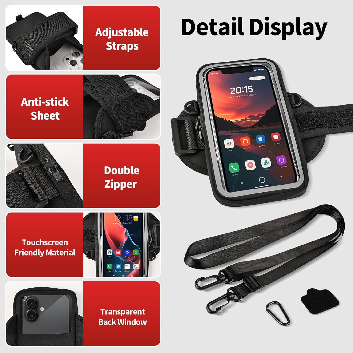 【Secure and Organized Storage】Keep all your essentials neatly organized and secure with our dual – pocket bag phone holder for running. The larger pocket can comfortably hold your smartphone, while the smaller pocket is perfect for storing earphones, ID cards, credit cards, cash, keys, and more. Making it the ideal travel companion