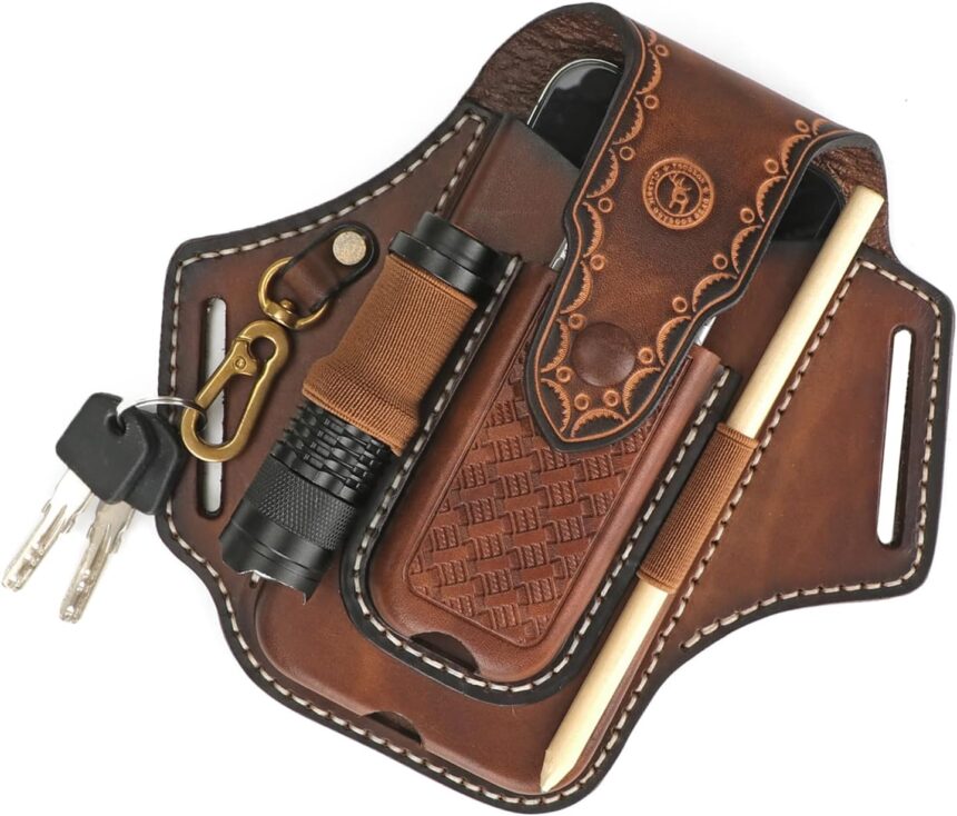 An all in one EDC leather pouch for men on belt, with a large phone pouch, a specific multitool sheath, also a flashlight sheath,one tactical pen holder and one keychain.