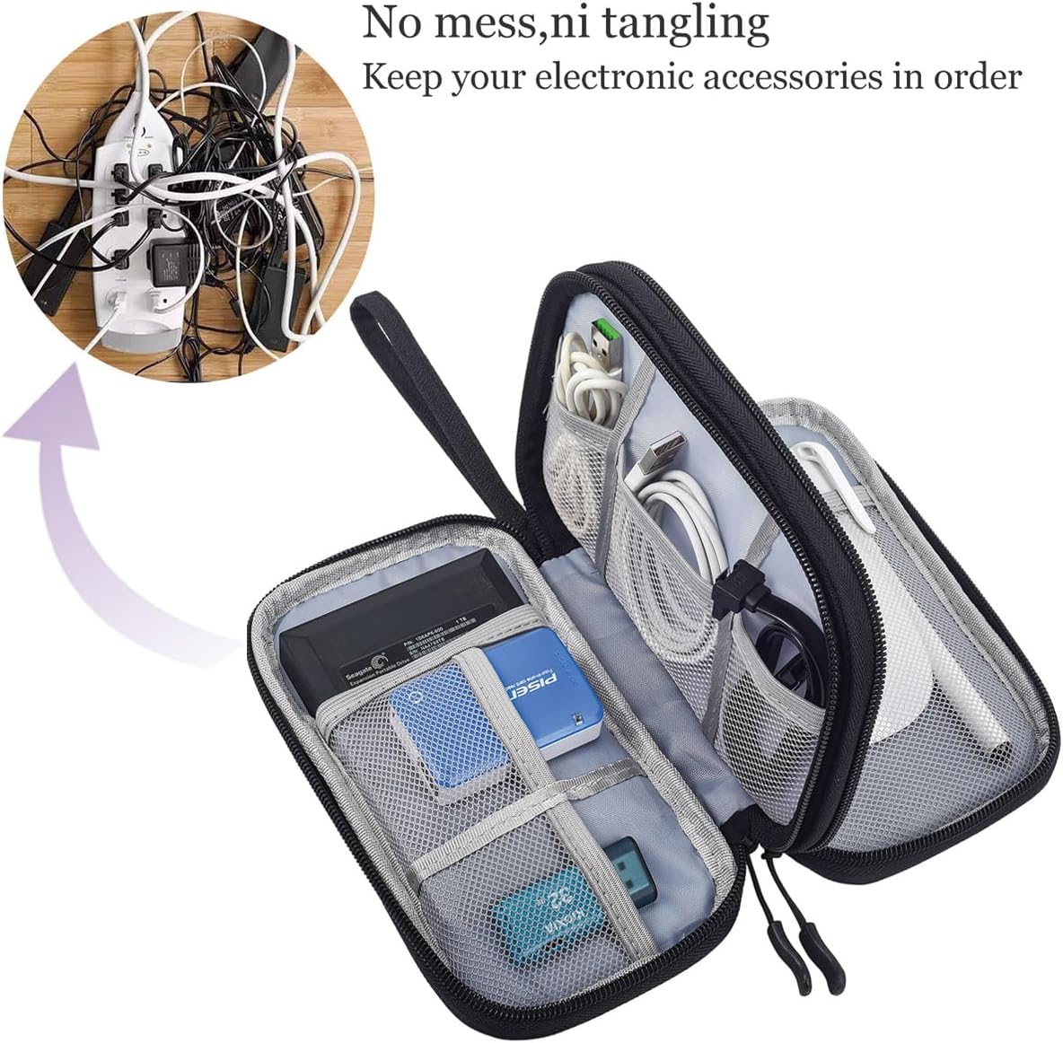 【Double Layers Design】The electronics storage bag comes with 2 compartments, designed to store electronic gadgets, such as power bank, mouse, hard drive, cables, external driver, flashdrive, chargers, USB cables, memory cards, earphones and other accessories.