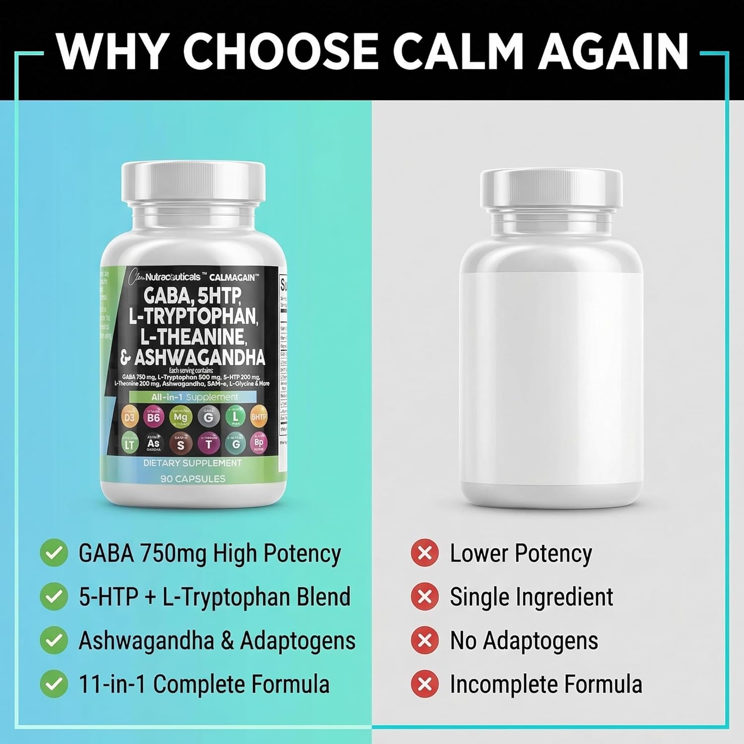 Introducing the CalmAgain All In One Supplement – In addition to containing large milligram dosages of L-Theanine 200mg and many 5 HTP Supplements, our formula also contains a whopping amount of GABA. This is a powerful alternative to GABA, L Theanine, Ashwagandha, and less potent Ashwagandha Capsules. Not your average L-Theanine Supplements, Ashwagandha Pills, and 5-HTP Capsules.