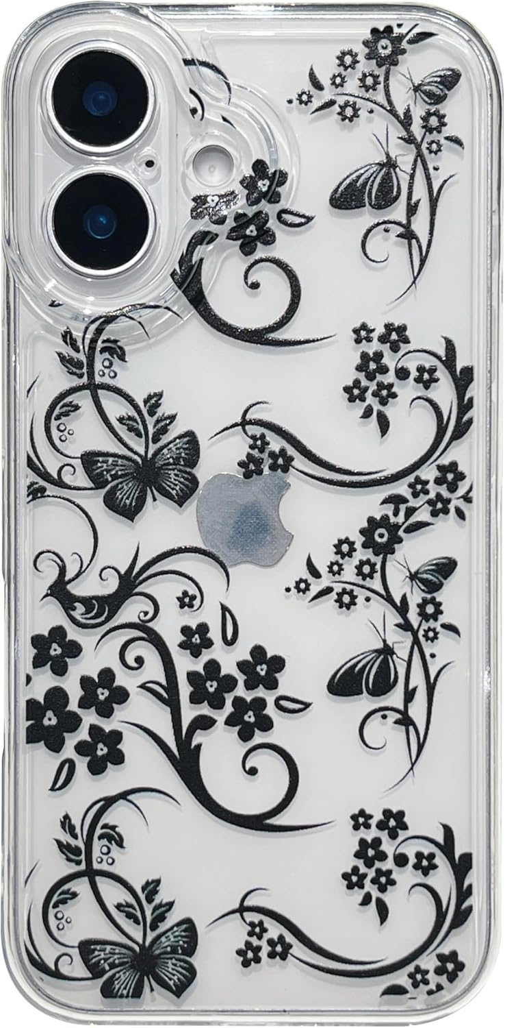 Designed for iPhone Case, Retro Black Flower Butterfly Clear Soft Phone Case (Clear,for iPhone 16)