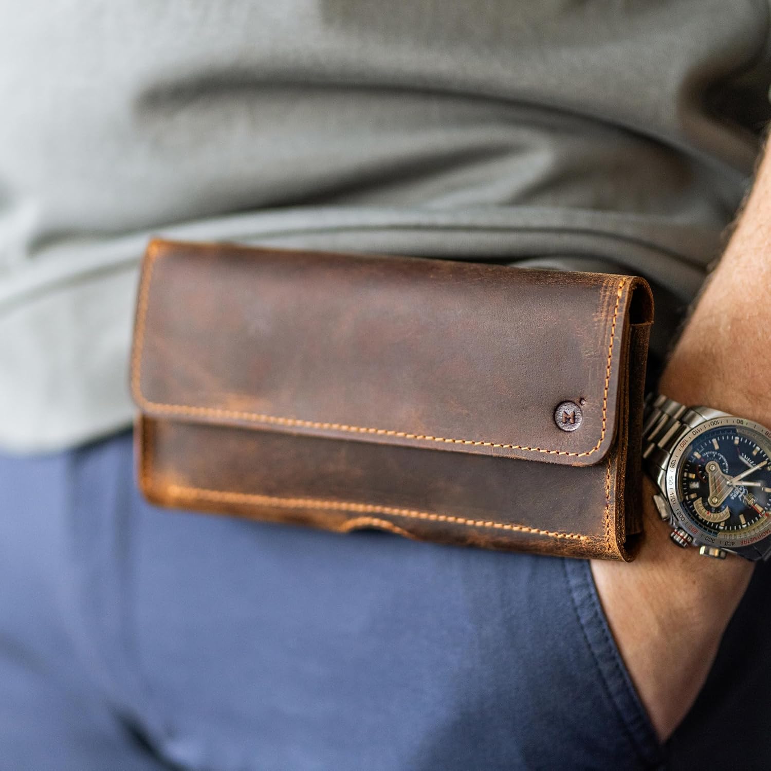 EMPTY POCKETS, SECURE ESSENTIALS: This horizontal leather phone holster features a strong 2-magnet flap closure, easy in-out push hole, extra card slot, and essentials compartment, ensuring your phone, money, keys, and cards stay safe