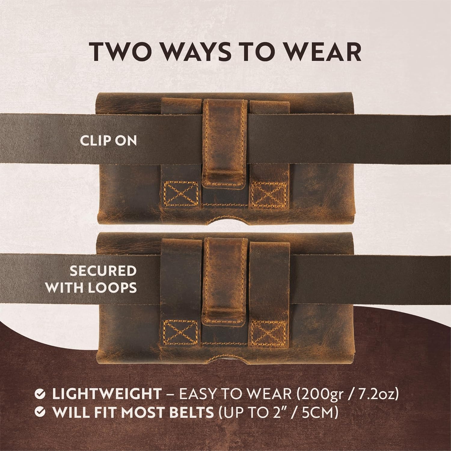 MADE FROM BUFFALO LEATHER: Our leather belt pouch for smartphones is handcrafted by artisans using durable, lightweight buffalo leather that wears beautifully, with sophisticated contrast stitching for a timeless look of our phone belt holder