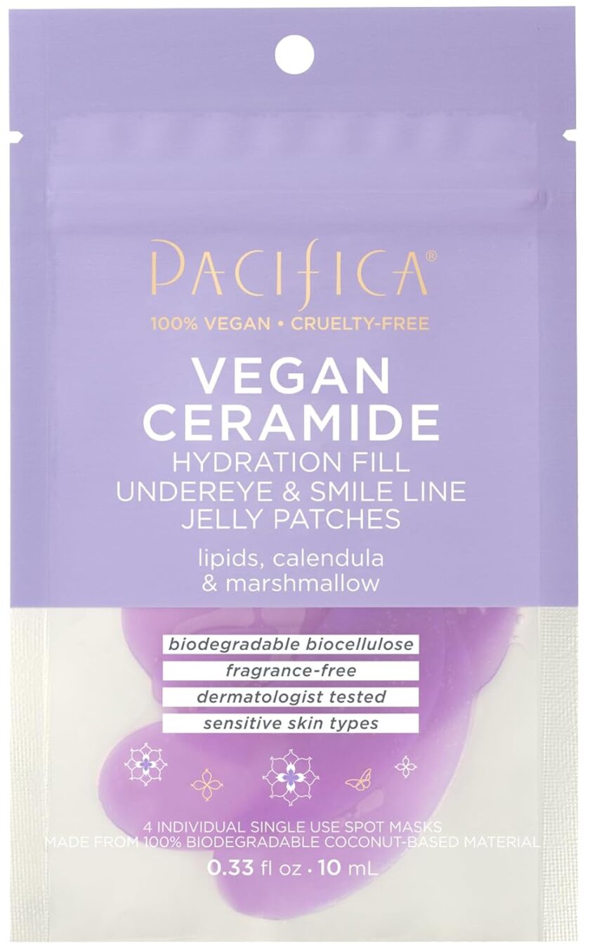 Pacifica’s Vegan Ceramide Hydrating Jelly Patches are a godsend for dry, sensitive skin that needs a healing touch. These unique gel patches are loaded with ceramides – the natural lipids that make up your skin’s protective barrier – along with hyaluronic acid to deeply hydrate. Designed for use under the eyes or on smile lines, they help repair and soothe the skin, reducing the appearance of fine lines caused by dryness and leaving your complexion comforted and moisturized.