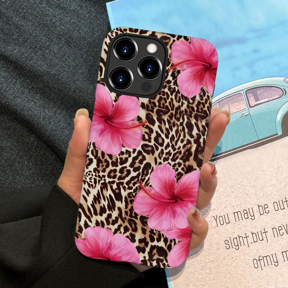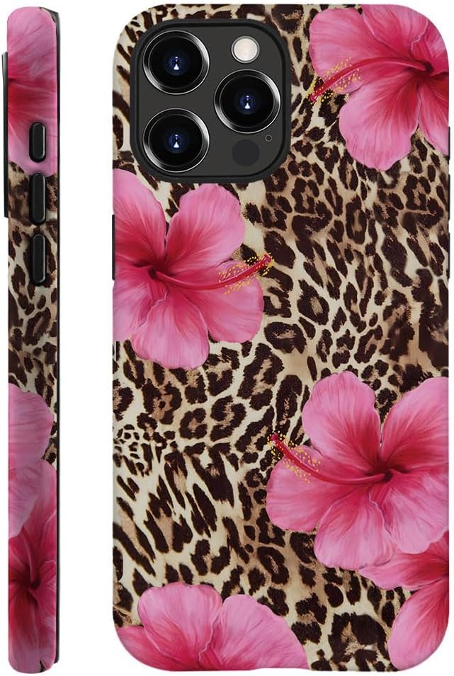 Case Compatible with iPhone 14 Pro Max,Scratch Resistant Hybrid 2-Layer Hard Shell Phone Case,Leopard Pink Hibiscus Tropical Floral