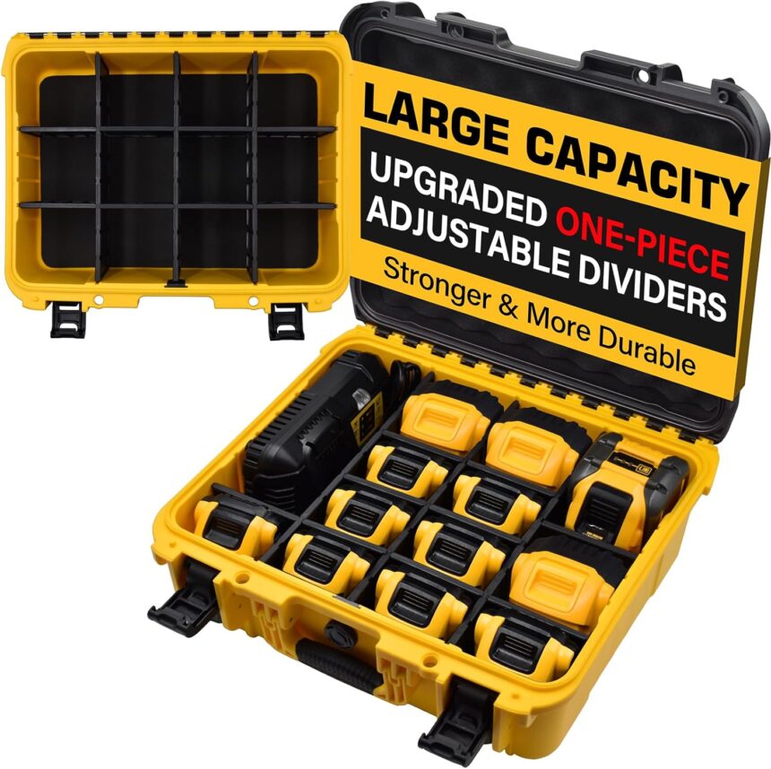 Case for Dewalt Battery – Waterproof Extra Large Hard Storage Box with 8 Adjustable One-Piece Molded Dividers, Heavy Duty Protective Organizer for Dewalt Battery and Charger