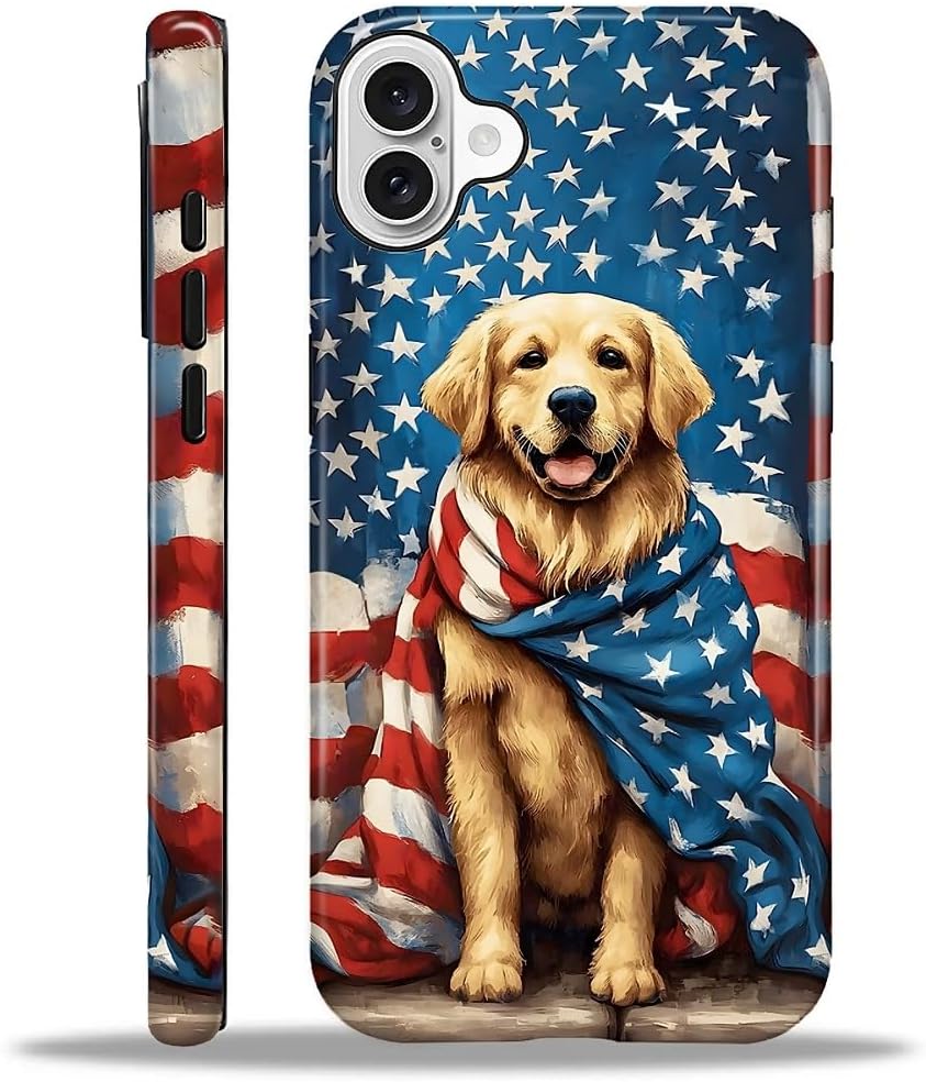 for iPhone 16 Case, Cute Dog with American Flag Pattern Glossy 2 in 1 Shockproof Bumper Drop Protective Case for Girl Women Boy Men