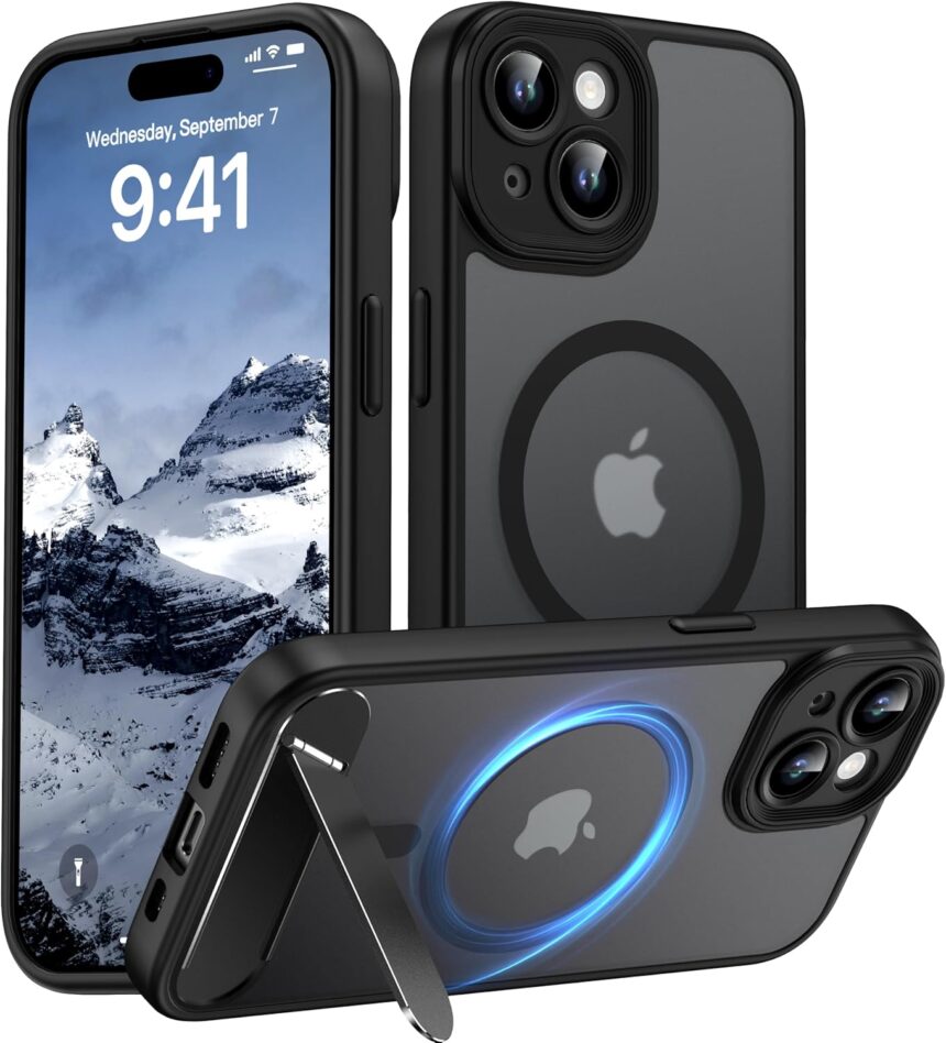Magnetic Compatible with iPhone 15 Case, [Built-in Invisible Kickstand][Compatible with MagSafe][Full Camera Protection] Translucent Matte Phone Case for iPhone 15 6.1″ Black