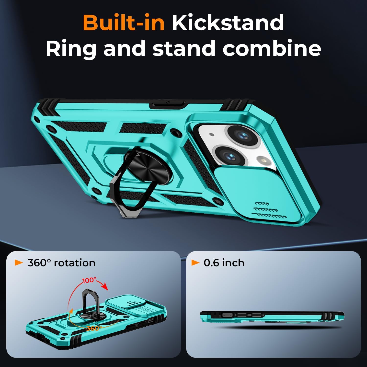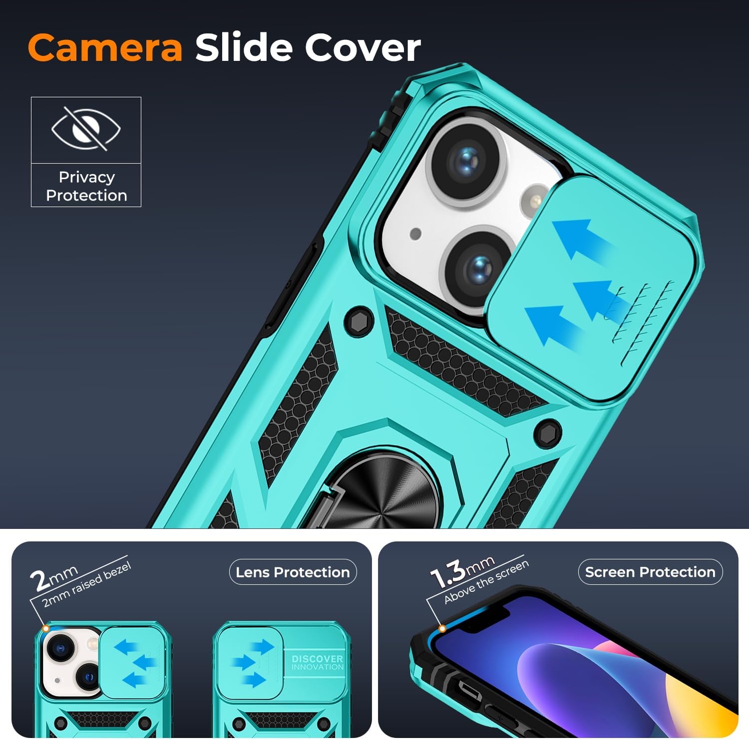 【Compatible with】Armor Case with sliding camera cover specially designed for iPhone 13 / 14 6.1 inch. NOT fit for other device! The precise cut out fits each button, camera, speakers and ports precisely, easy to press and access. ⚠️Notice: Due to the metal ring on the back, the case will NOT work with wireless Charging function