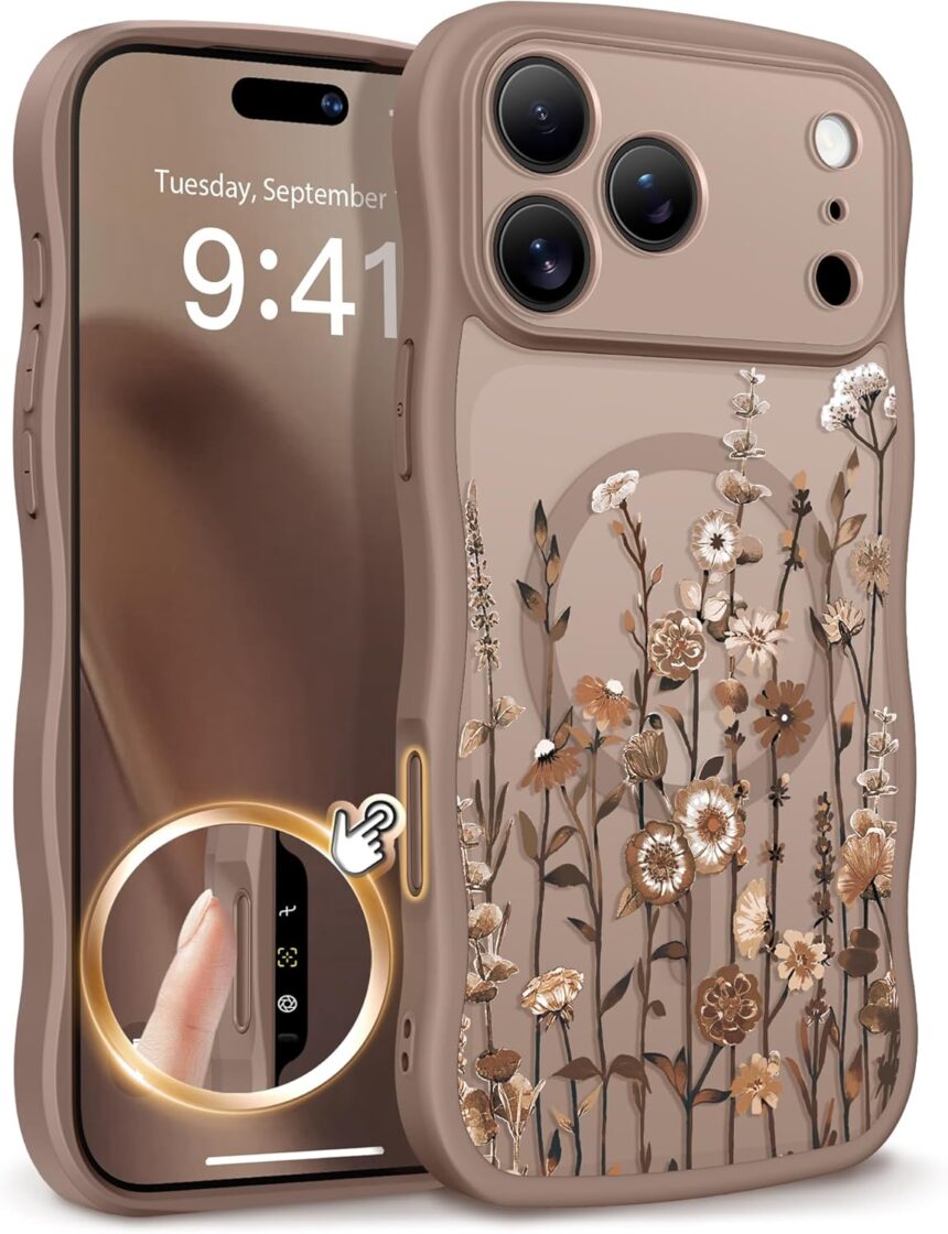 GVIEWIN for iPhone 17 Pro Max Case Compatible with MagSafe [Curly Wave Edge][Full Camera Protection] Floral Translucent Shockproof Magnetic Women Phone Case for 17 Pro Max, Floratopia/Brown