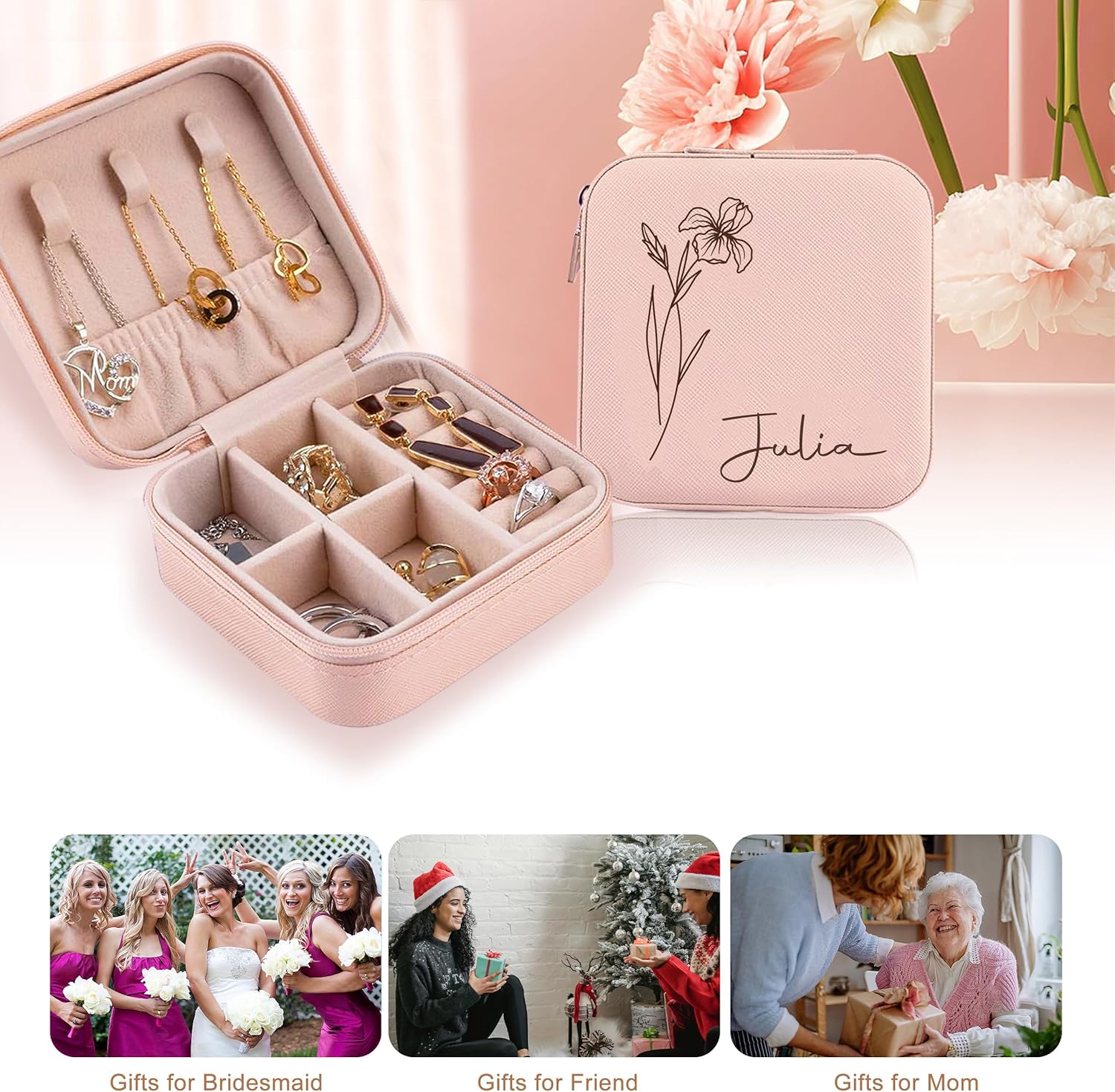 Customized & Gorgeous: Custom Travel Jewelry Box with Birth Flower & Name, Personalized Small Travel Box as Bridesmaid Proposal Gifts for Women, Customized Matron of Honor Gifts for Her. Designed to make your bridesmaid proposal unforgettable.